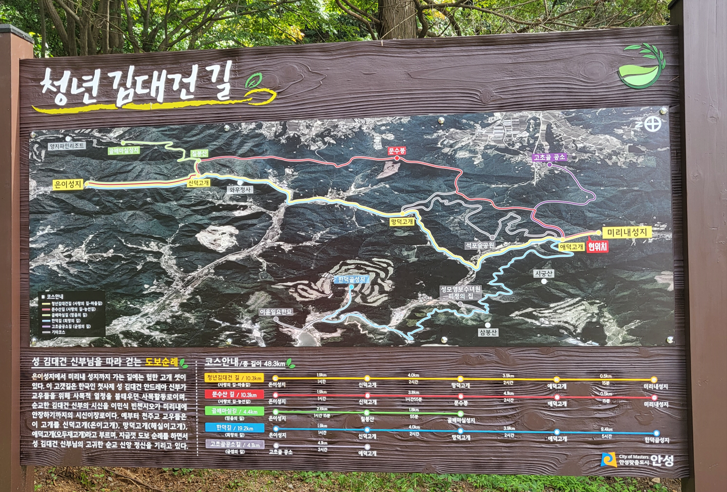한국판 산티아고 순례길인 '청년 김대건 길'은 총길이 48.3Km이며, 1코스인 청년김대건길은 미리내성지 –> 애덕고개 –> 망덕고개 –> 신덕고개 –> 은이성지(용인)까지 10,3Km로 사랑의길-마을길로 부르며, 문수산길은 미리내성지 –> 애덕고개 –> 문수봉 –> 신덕고개 –> 은이성지까지 10.3Km 로 사랑의길-능선길이고, 골배마실길은 골배바실성지 –> 칠봉산 –> 은이성지까지 4.4Km로 믿음의 길, 한덕길은 한덕골 성지 –> 애덕고개 –> 망덕고개 –> 신덕고개 –> 은이성지까지 19.2Km로 희망의 길이다. 고초골공소길은 애덕고개 –> 고초골 공소까지 4.1Km로 굳셈의 길이다.