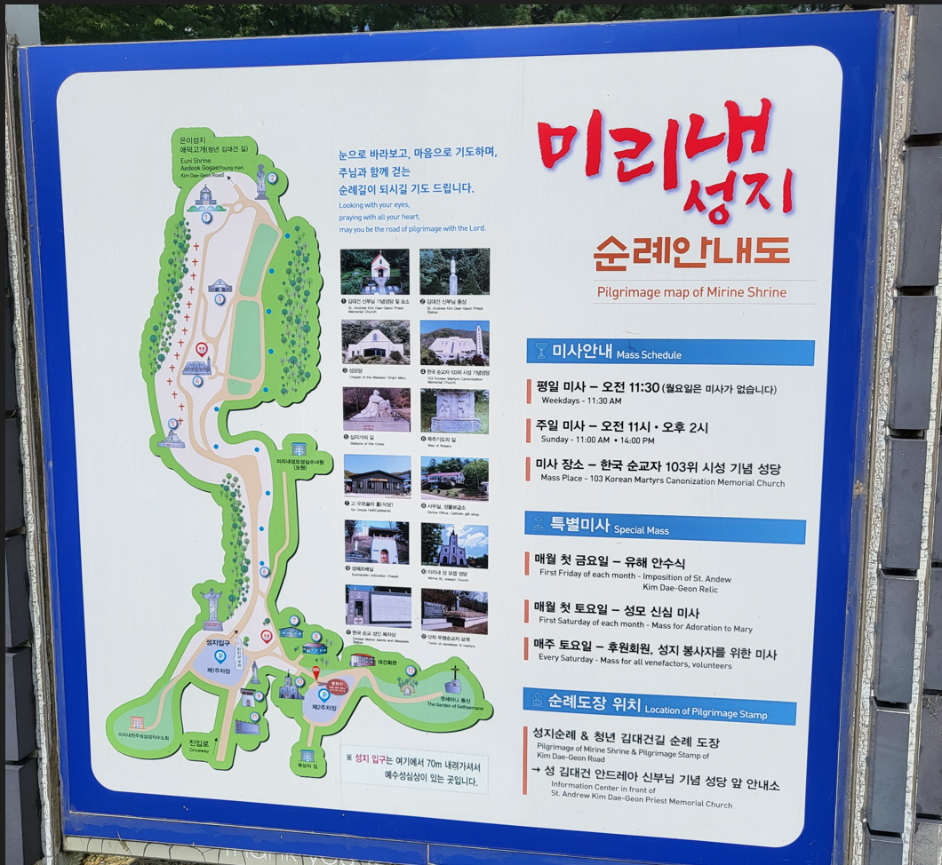 시작지점에서 먼저 미리내성지를 둘러 보기로 했다. 성지의 이름인 미리내는 한국의 고유어(순 우리말)로 은하수라는 뜻이다. 이 성지에 미리내라는 이름이 붙게 된 이유는 신유(1801년), 기해(1839년) 박해 때 천주교 신자들이 이곳으로 숨어들어 옹기를 굽고 화전을 일구며 살았는데, 이들이 피운 불빛이 깊은 밤중에 보면 은하수처럼 보인다는 것 때문이었다. 행정구역상으로는 한자로 미리천(美里川)으로 표기하며, 이를 산촌의 이름을 따서 미산리(美山里)라고 명명하게 되었다.