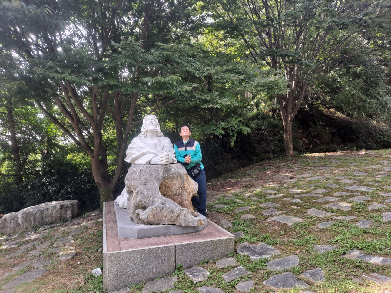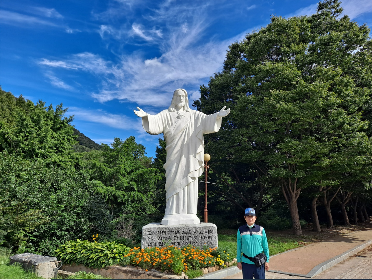 9월의 높고 파아란 하늘빛과 어우러진 예수님 조형물에 새겨진 마태복음 11장 28절 "고생하며 무거운 짐을 지고 허덕이는 사람은 다 나에게로 오너라 내가 편히 쉬게 하리라". 그 앞에 서니 경건함과 평온함을 동시에 갖게 됨을 온몸과 맘으로 휘감아 느낀다.