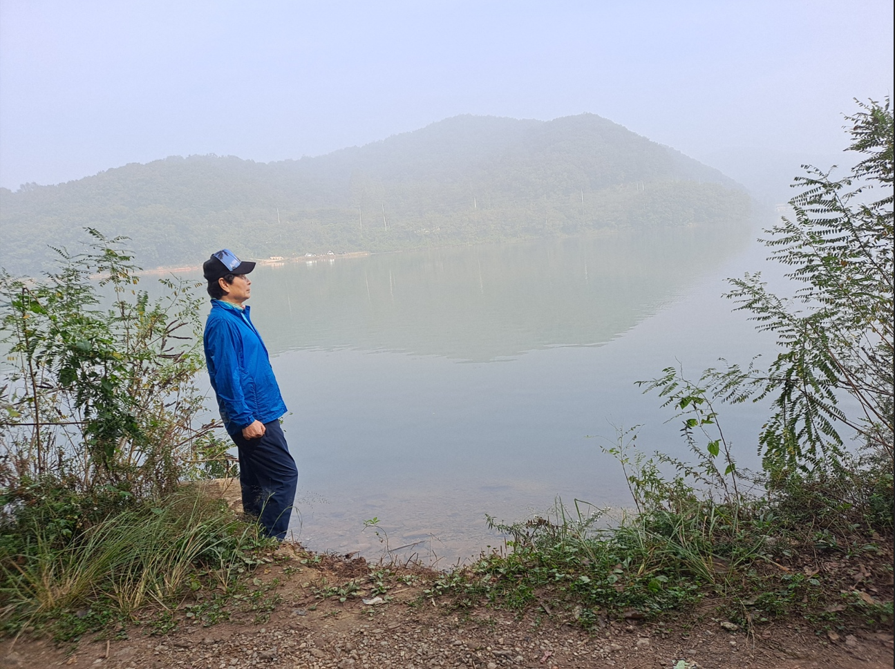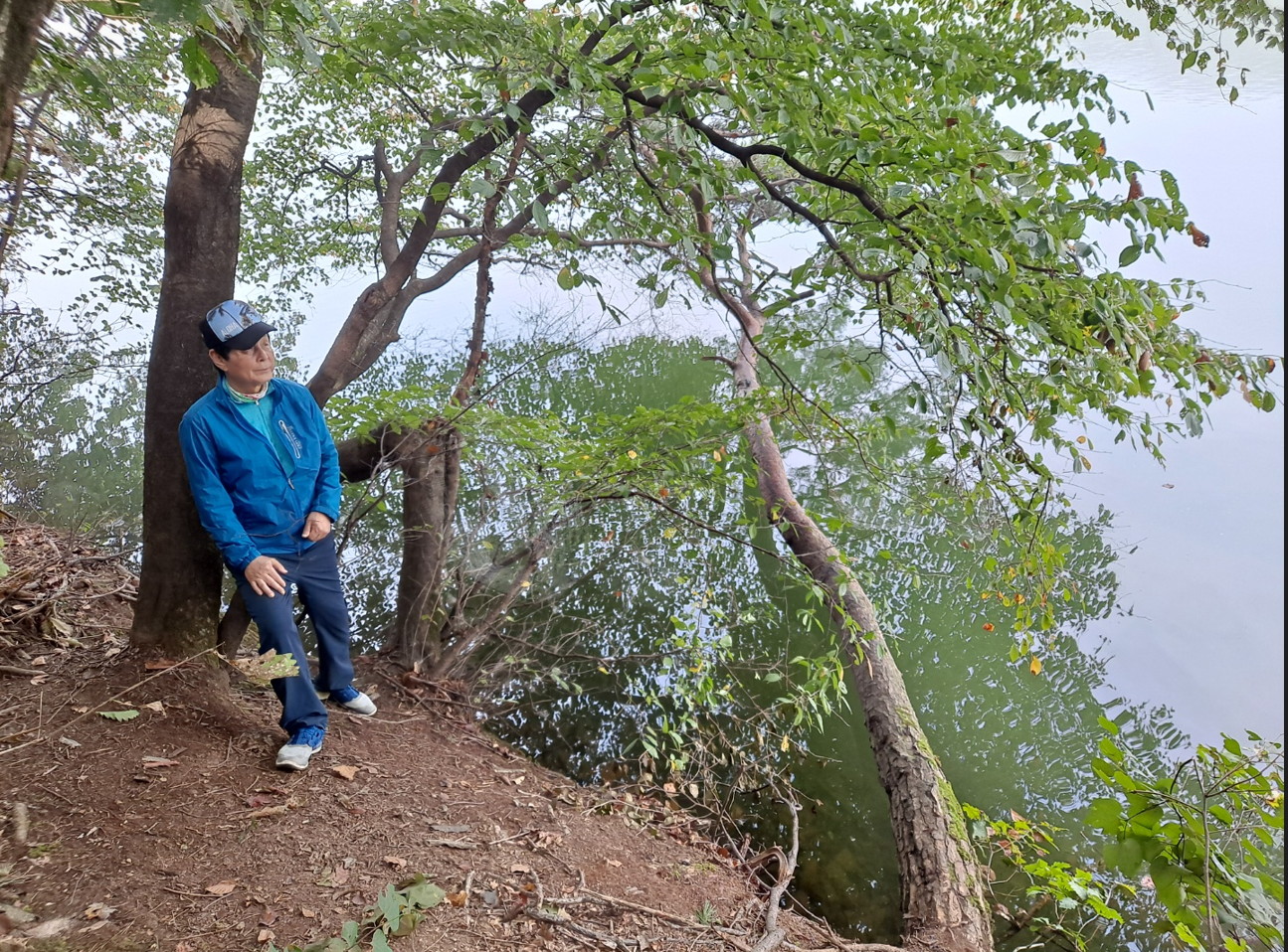 캠핑하며 낚시도 즐기는 젊은이들의 사이를 돌아서 낚시인들이 호숫가를 돌아가며 만든 작은 오솔길을 들아보니 물위에 드러누운 소나무 한그루가 포토존을 만들어 놓았다. 도심속에서 한주일간의 업무에 찌든 갇힌 생활에서 해방되어 자연속에서 자유롭게 맛보는 힐링의 시간은 이렇게도 신비롭게 아름답다.