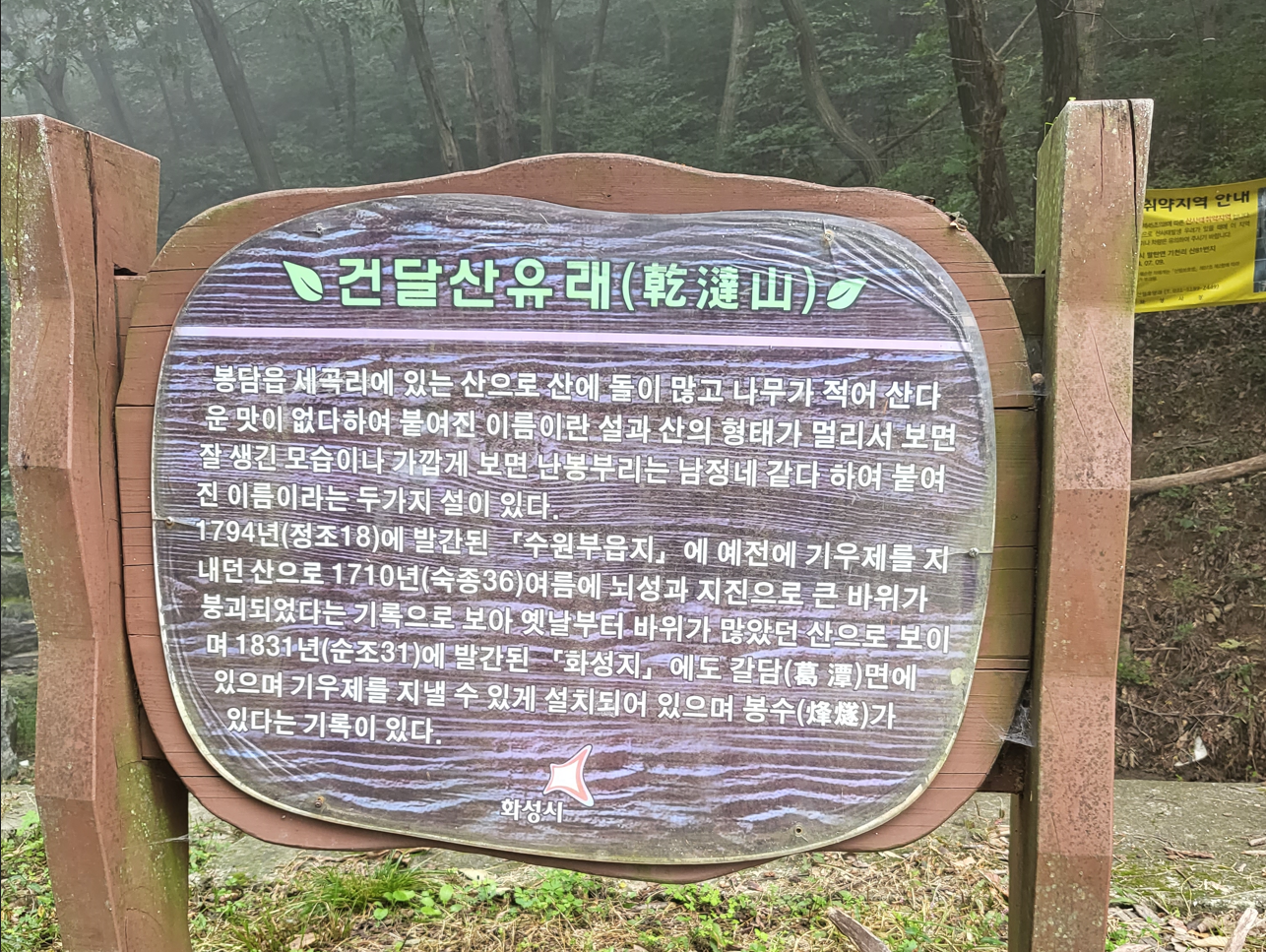 여길 찾은 목적은 그냥 주말이면 가까운 산천경개 찾아서 눈으로 자연을 보고 몸으로는 즐겁게 만보이상 걷는 그런거 였기에, 이전에도 올랐던 화성의 대표 명산인 건달산에 오르는 2개의 코스 중 하나이기에 시월의 첫날에는 그냥 낭만스럽게 짙은 안개속으로 오솔길따라 산길을 걷기로 했다.