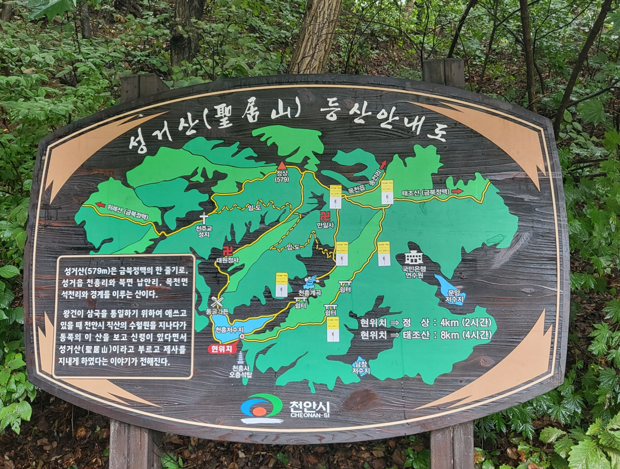 성거산의 높이는 579m이다. 천안 시가지 동북쪽에 자리잡고 있다. 고려 태조 왕건이 삼국을 통일하기 위하여 애쓰고 있을 때 천안시 직산읍 산헐원을 지나다가 동쪽의 이 산을 보고 신령이 있다면서 성거산이라고 부르고 제사를 지내게 하였다는 이야기가 전해진다.