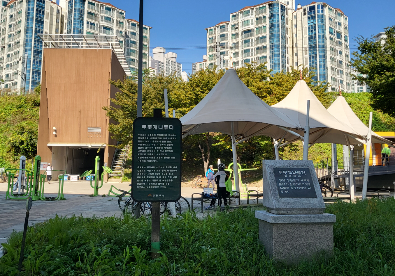 한남대교와 동호대교 사이 강변북로과 나란히 간선도로가 나있으며, 두무개란 중랑천과 한강의 두물이 만난다는 뜻에서 두뭇개 나루터라는 이름이다. 조선시대에는 이곳을 두뭇개 · 두멧개 · 두물개 또는 한자명으로 두모주 · 두모포라고 불렀다. 동쪽에서 흘러오는 한강의 본류와 북쪽에서 흘러오는 중랑천의 물이 합류되는 데서 이름이 유래되었다. 서울 지하철 3호선 옥수역 3번 출구 근처에 있는 두뭇개나루터 자리이다.