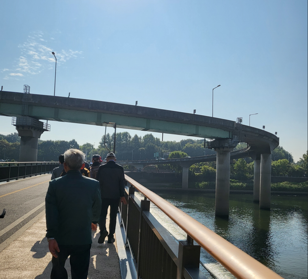 청명한 시월의 가을 하늘아래 유유이 흐르는 한강변을 무리지어 걷고 있는 우리들의 모습이 너무나도 정겹다. 이제는 모두들 현업에서 은퇴하여 연금으로 준비된 노후의 삶을 편안하게 살고 있어서, 세월을 이기는 사람이 없기에 희끗한 백발을 감출 수 없음도 옛정이 그리워 멀리 정읍으로 귀촌하여 사는 멤버도 KTX편으로 올라와서 모임에 참석하는 지극한 성의를 보여준다. 동서남북 사방 각처에서 이곳으로 모였음에도, 그래도 그럼에도 불구하고 상계동에서 자전거를 타고 무려 21Km를 달려 왔다는 멤버의 젊은 모습이 우리모두 함께 보조를 맞춰 걷기위해 자전거를 끌고 다니면서도 철철 흘러넘치는 활력 앞에 모두가 그저 부러워할 뿐이다.