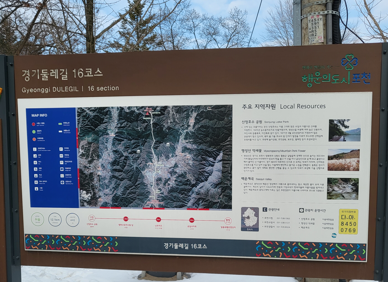 행운의 도시 포천을 걷는 경기둘레길 16코스는 이곳 산정호수에서 출발하여 산정호수공원~> 산정호수~> 상동주차장~> 경기도평화교육연수원앞~> 낭유대교~> 운담교차로~> 일동유황온천단지로 거리는 12.7Km이며, 약 4시간 15분 정도 소요되는 코스이다.