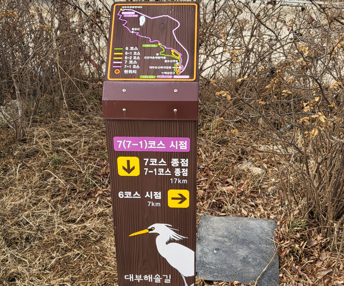 대부해솔길 6코스의 시점이며, 7코스의 종점이라는 표지판이다. 대부해솔길은 해안선을 따라 대부도를 한 바퀴 둘러볼 수 있는 산책길로 경기도 안산시 단원구에 있다. 대부도의 자연경관을 바라보며 걸을 수 있는 산책길은 총 11개 코스가 있다. 그중 대부해솔길 6코스는 대부도펜션타운에서 출발해 경기창작센터, 경기도청소년수련원, 불도방조제를 지나 탄도항으로 도착하는 7km의 코스로 2~3시간이 소요된다. 6코스 끝에는 전망대가 있어 탄도항의 탁 트인 경치를 한눈에 볼 수 있다. 11개 코스 중 교통편이 가장 편리하다.