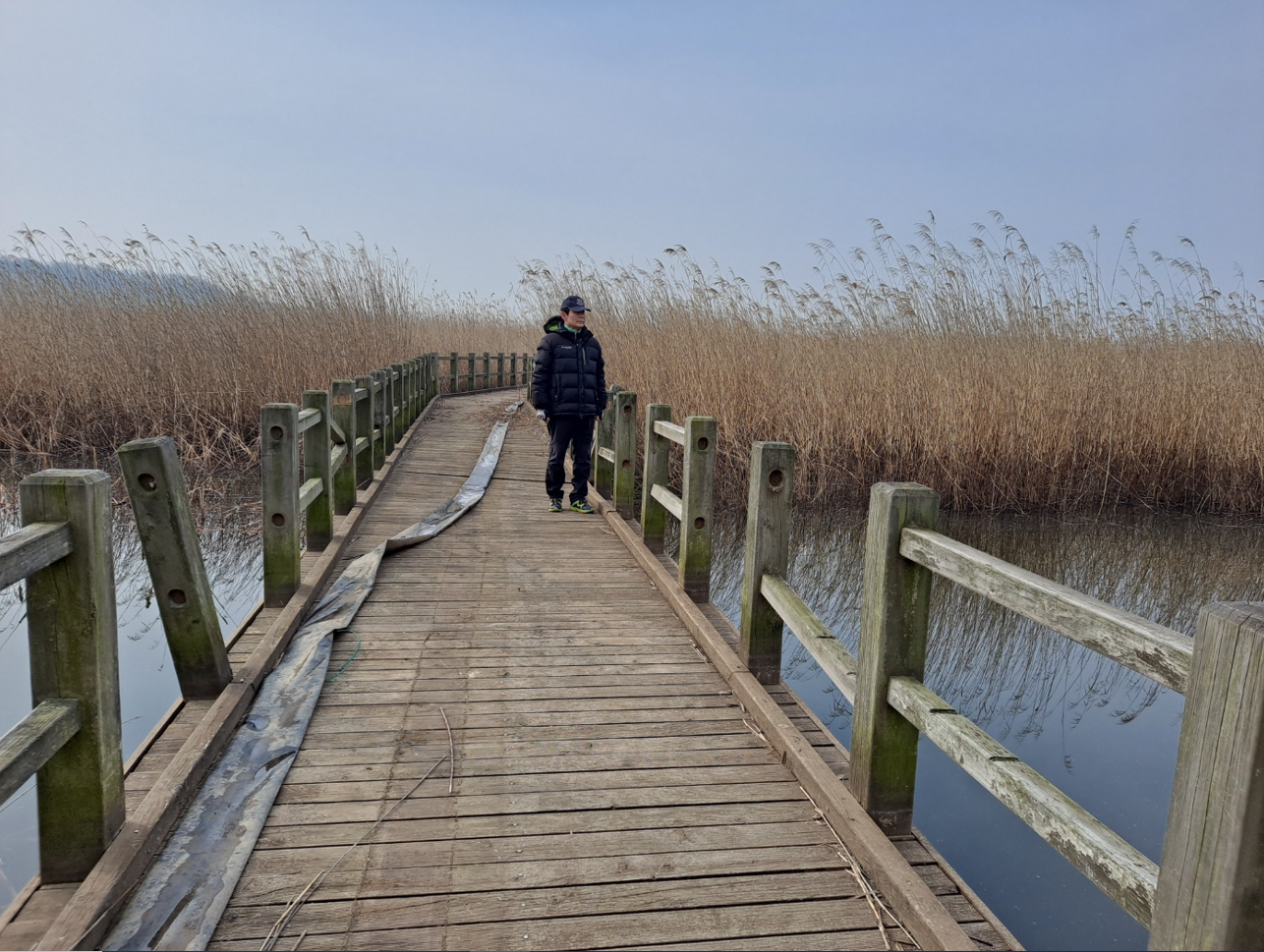 네비게이션에서 알려주는 대로 그냥 찾아왔더니, 흡사 시골길 농기계만 다닐법한 그런 길이라서 정말 조심스레 운전하며 이곳을 찾아 왔는데, 일반 도로가 이어지는 입구 쪽에는 철조망으로 만든 대문이 잠겨 있었다. 습지공원 안으로 들어가는 입구는 막혀있어서 자동차는 출입을 못한다. 입구에 주차를 하고나서 잠긴문 사이로 그냥 걸어서 들어왔다. 사람들의 모습이 거의 보이지 않는 광경은 너무 휑한 풍경이지만, 가도 가도 끝이 없는 습지가 맑고 고운 공기를 무한정 공짜로 배달해 주는 것 같아 감사한다.