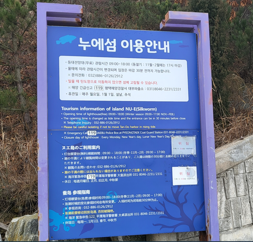 탄도항에서 누에섬으로 난 바닷길의 오른쪽에 솟아있는 두개의 돌섬이 보인다. 이곳으로도 도로가 개설돼 있어서 걸어보니 이 돌섬은 아마도 바닷새들의 쉼터인거 같다. 바위 위에는 온통 새들의 배설물인 듯 하이얀 페인트로 칠해 놓은 모습이 보인다.