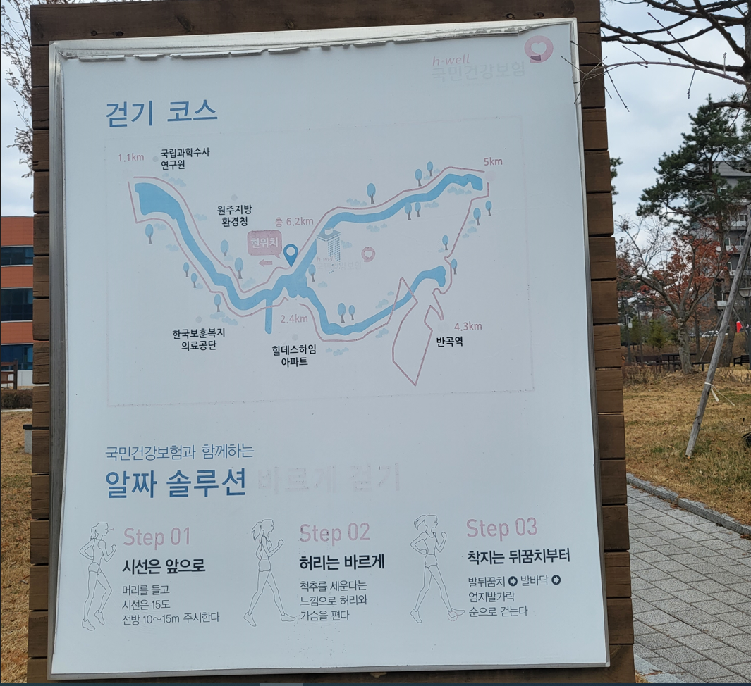 "걷기 코스" 안내판이다. "국민건강보험과 함께하는 알짜 솔루션 Step 1: 시선은 앞으로 - 머리를 들고 시선은 15도 전방 10~15m주시한다. Step 2: 허리는 바르게 – 척추를 세운다는 느낌으로 허리과 가슴을 편다. Step 3: 착지는 뒤꿈치부터 – 발뒤꿈치 -> 발바닥 -> 엄지발가락 순으로 걷는다."