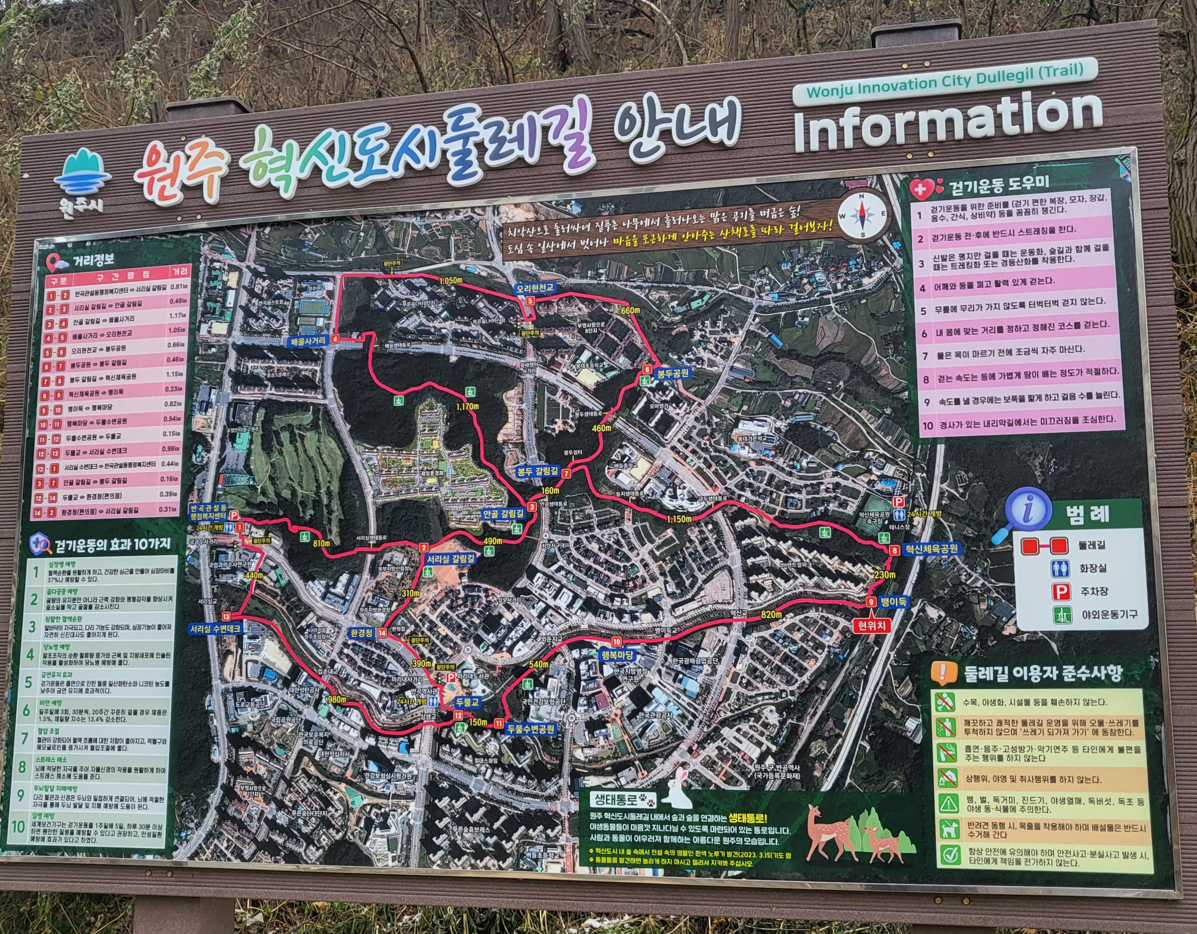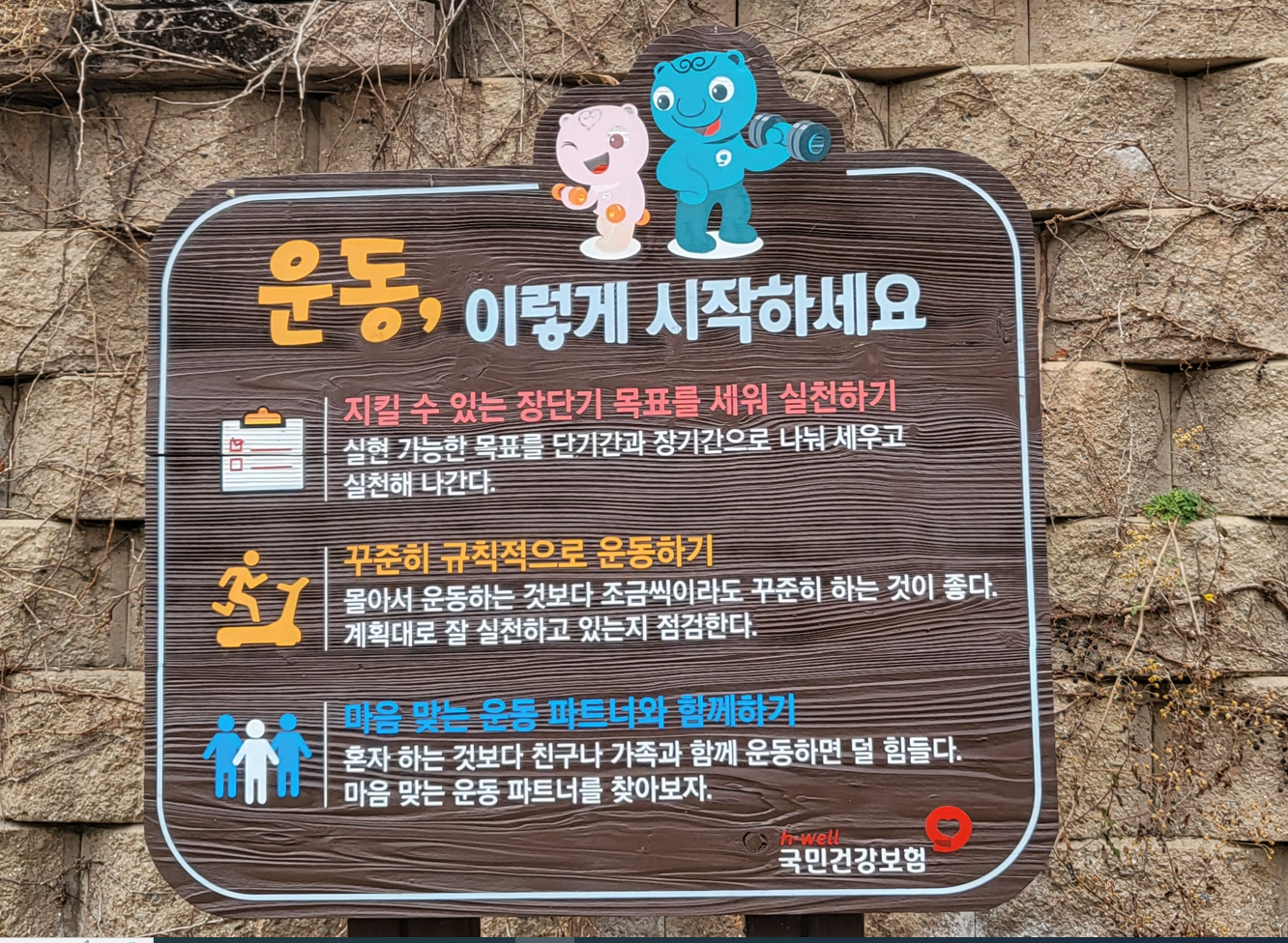 이곳에 있는 국민건강보험공단에서 원주혁신도시 둘레길에 세운 운동안내판이다. "운동, 이렇게 시작하세요: 지킬 수 있는 장단기 목표를 세워 실천하기: 실현 가능한 목표를 장기간으로 나눠 세우고 실천해 나간다. 꾸준히 규칙적으로 운동하기: 몰아서 운동하는 것보다 조금씩이라도 꾸준히 하는 것이 좋다. 계획대로 잘 실천하고 있는지 점검한다. 마음 맞는 운동파트너와 함께하기: 혼자 하는 것보다 친구나 가족과 함께 운동하면 덜 힘들다, 마음 맞는 운동 파트너를 찾아보자." - 국민건강보험