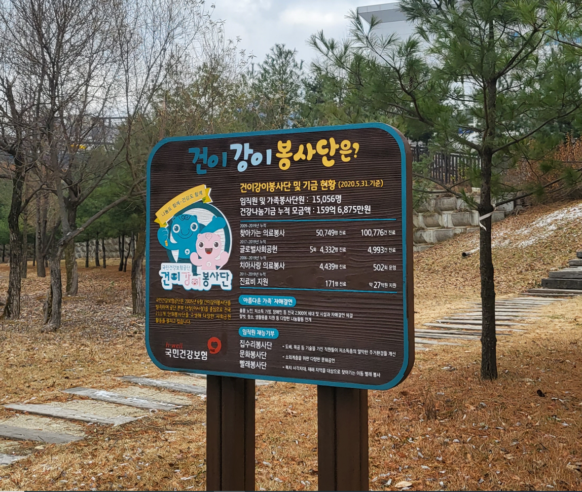 "건이 강이 봉사단은?" 나눔도 함께, 건강도 함께 한다는 건이 강이 봉사단 및 기금 현황(2020.5.31. 기준)이 안내팻말로 보인다. 국민건강보험 임직원 및 가족봉사단 15,056명의 건강나눔 기금 누적 모금액: 159억 6,875만원이다. 이 3년전 현황표를 보면서 이 분들의 나눔과 헌신의 커다란 모습에 너무 감사한 마음이 든다. 나는 지금까지 누구랑 뭘 나누며 어떻게 살았는지 반성도 하면서 말없이 조용히 걷는다.