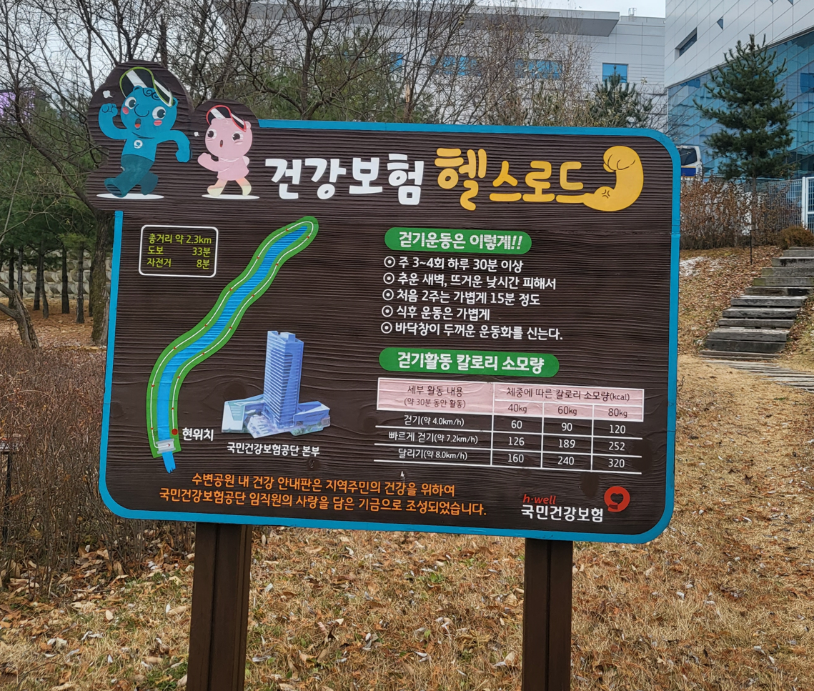 둘레길 코스의 바닥에는 "국민건강보험공단과 나눔도 함께, 건강도 함께!"라고 눈에 확 뜨이게 붉은바탕에 흰글자로 큼지막하게 써 놓았다. 국민건강보험공단은 국민건강보험법 법률 제5854호로 1999.2.8.제정되었으며, 국민의 질병·부상에 대한 예방·진단·치료·재활과 출산·사망 및 건강증진에 대하여 보험급여 실시를 목적으로하는 기관이다.