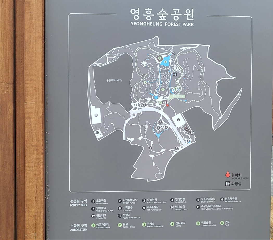 경기도 수원시 영통구 영통로 435에 위치한 영흥수목원은 영흥숲공원이 둘러싸고 있는 산지 지형을 살려 조성된 수원시의 식물원 2곳(일월식물원, 영흥수목원) 중 하나이다. 수목원에 들어서면 푸른 잔디밭과 다양한 테마의 숲과 공원을 볼 수 있고 이곳의 랜드마크인 온실에는 이국적인 느낌을 주는 독특한 식물들을 볼 수 있다. 방문자센터에서 많은 사람들이 줄서서 입장티켓을 끊는데, 나는 입장료 4,000원이 신분증 제시로 그냥 들어가도 되는 꼰대나이에 해당된다면서 무료 발권해준다.