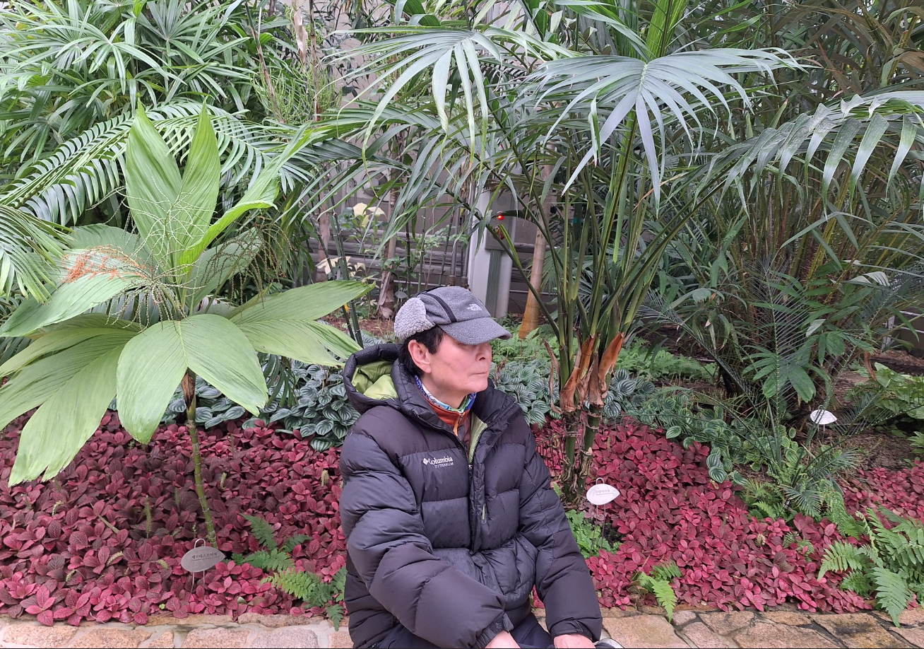 바위에서 폭포처럼 물이 흐르는 모형 인공폭포수 아래를 지나며 증적을 남긴다. 한겨울에 만나는 폭포수는 대부분 물줄기가 고드름으로 얼어붙어서 하얀 산맥처럼 보이는데, 이곳 온실에서는 물이 좔좔 소리내어 흐르는 풍경이 참으로 멋지다는 느낌이 된다. 그런저런 이유로도 정겨움에 젖어들어서 손바닥으로 흐르는 물줄기를 잡아보기도 하면서 철없이 순간적인 동심으로 돌아간다.