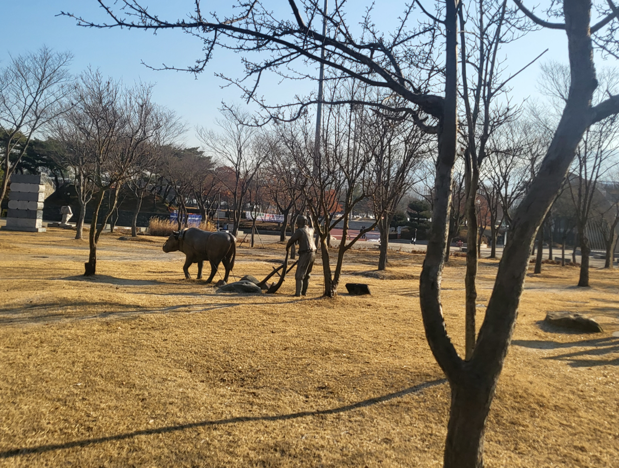 관문공원 잔디밭에는 소를 몰고 쟁기질을 하는 동상작품이 있어서 우리들 세대에는 어린시절에 늘 접하던 풍경이라서 그런지 한 눈에 쏙 들어온다. 관문동을 지나서 남태령고개를 넘을 때 병정들이 도적으로부터 보호해준다는 명목으로 지나가는 여행객에게 고개넘이 돈을 뜯어냈단다. 남태령은 원래 여우고개였는데, 조선시대 정조대왕이 부왕인 사도세자의 능(隆陵)으로 참배하러 가는 길에 고개 이름을 묻자 차마 여우라는 말을 입에 담기 어려워 이방(吏房) 변씨가 삼남대로로 통하는 길이라고하여 남태령(南泰嶺)으로 고쳐 불렀다고 전한다.