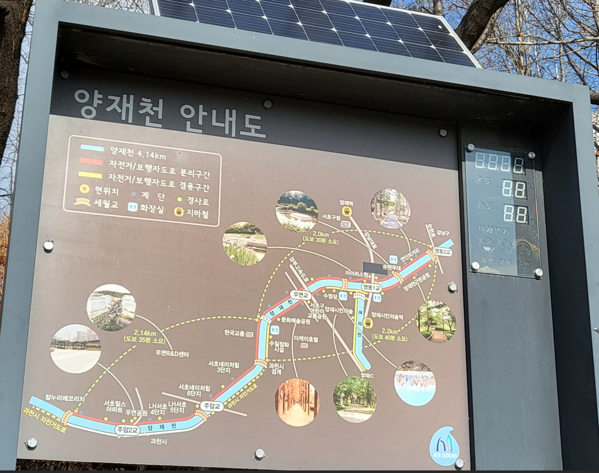 양재천 4.14Km 서초구안내도를 보면서 양재천을 가로지른 영동1교, 영동2교, 영동3교를 바라보며 걷는다. 양재천은 관악산에서 발원해 과천 구간을 거쳐 서울 서초구와 강남구를 지나 탄천으로 합류하는 하천이다. 과천시와 서초구 및 강남구를 지나는 총 하천연장 18.5km에 달하는 양재천의 원래 이름은 공수천(公需川 또는 公須川)이었는데 이제는 인근 지명만이 옛 물길을 짐작케 한다. 양재천 물길 위 여울이 형성되는 곳에 백로가 날아들었다는 ‘학여울(학탄:鶴灘)’, 대치동 미도아파트 부근에 있던 포구(浦口)의 흔적 ‘개포동(開浦洞)’ 등이 그것이다. 개포동에 살면서 강남역까지 걸어서 출퇴근하면서도 콧노래를 부르며 즐거웠던 그 시절의 젊음이 30년전의 기억속에 묻혀 있어도 새록새록 떠 오르는 아름다운 추억이다.