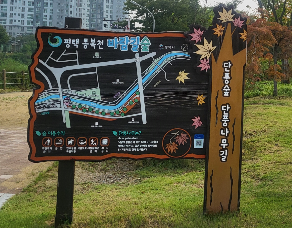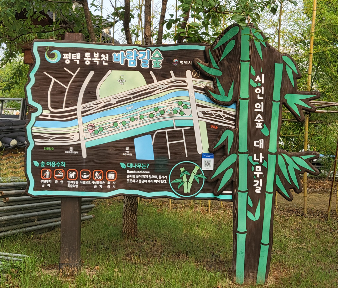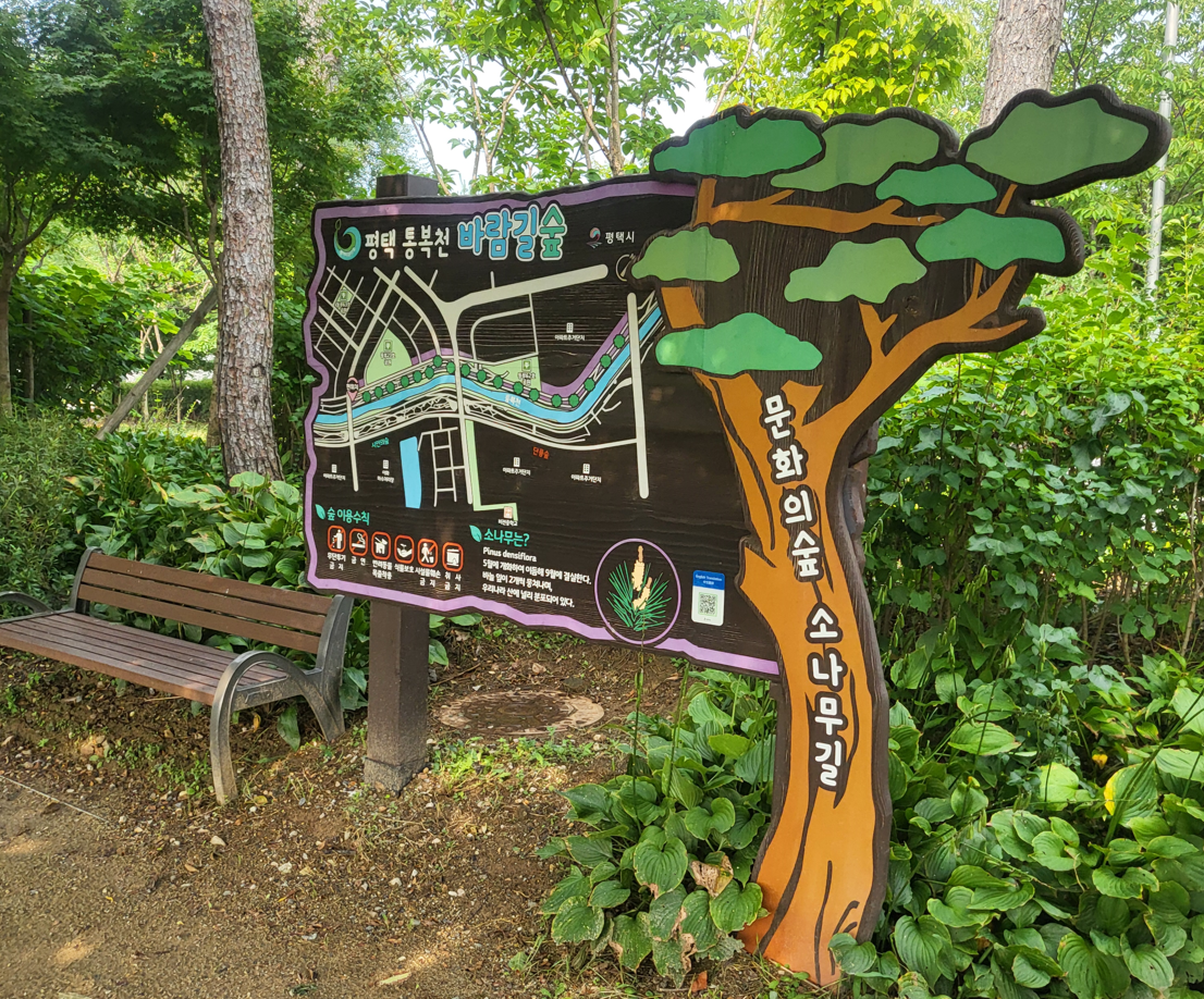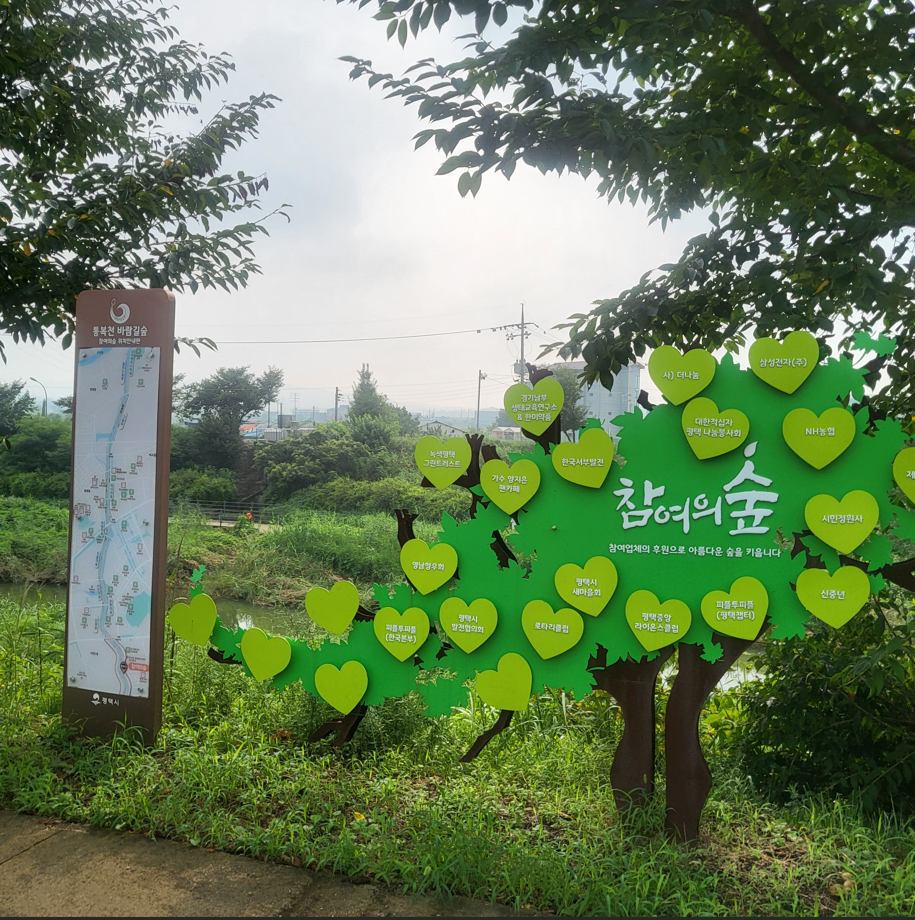 '삼성전자 바람길 숲 정원 안내도'에 쓰여져 있는 내용이다. "삼성전자 DS부문 평택캠퍼스는 깨끗한 공기와 아름다운 풍경을 가진 도시숲을 함께 만들어 나가기 위해 통복천 시민참여의 숲 조성에 참여하였습니다. 평택시 친환경 시민참여 도시숲 조성을 삼성전자가 응원하겠습니다." 바람길 소리정원에서 숲정원까지 삼성전자가 참여한 곳을 그림으로 함께 안내하고 있다.