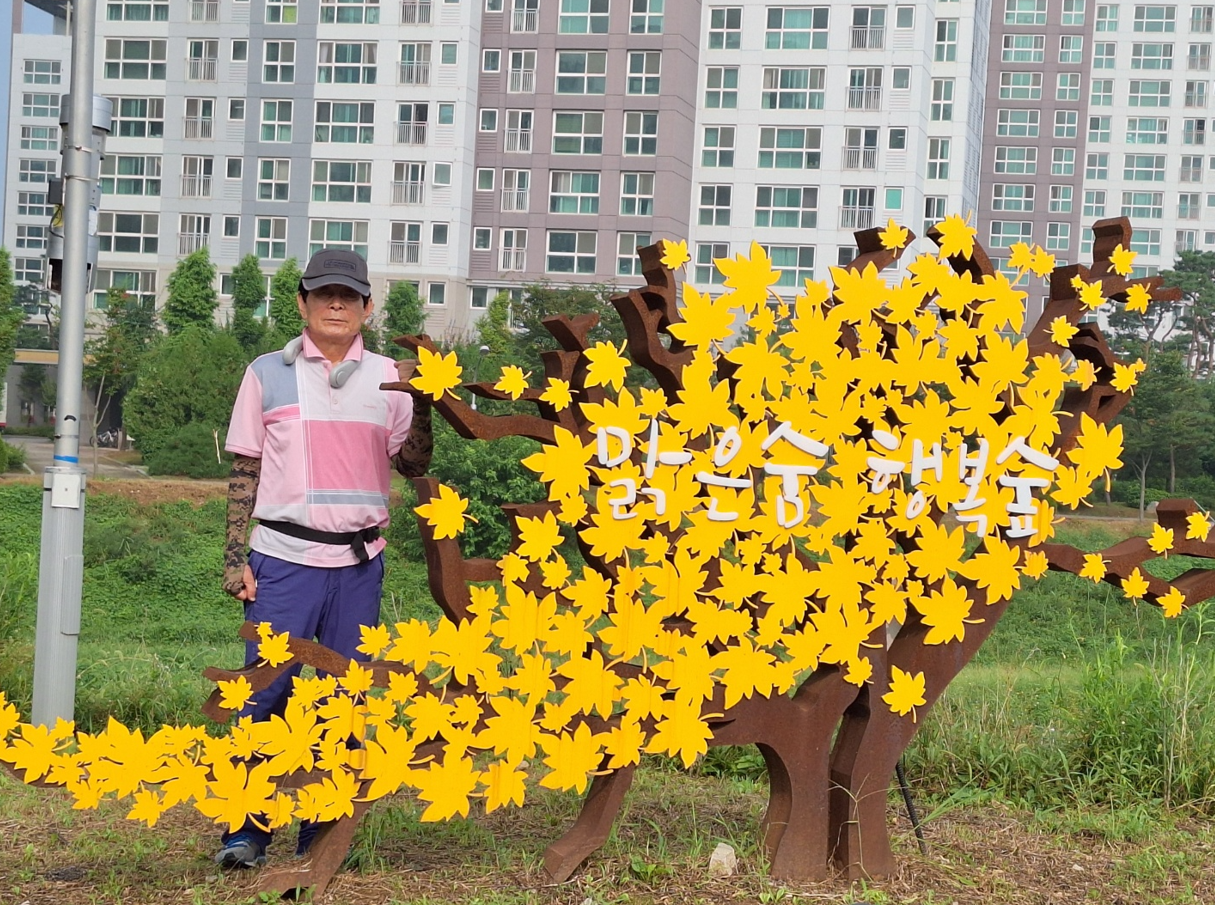개울가를 따라서 지루하게 걷던 길에서 눈에 번쩍 뜨이는 '맑은 숨 행복 숲' 이라는 노오란 조형물을 만난다. 노오란 단풍나무를 표현한 작품인 것 같다. 단풍나무는 단풍나무과에 속하는 낙엽활엽교목이다. 가을에 붉은색으로 변하는 데서 생긴 이름이지만, 변하지 않는 종류도 있다. 산지에서도 자라지만 관상용으로 많이 이용된다. 수액(樹液)은 당분이 높아서 음료로 사용할 수 있다.
