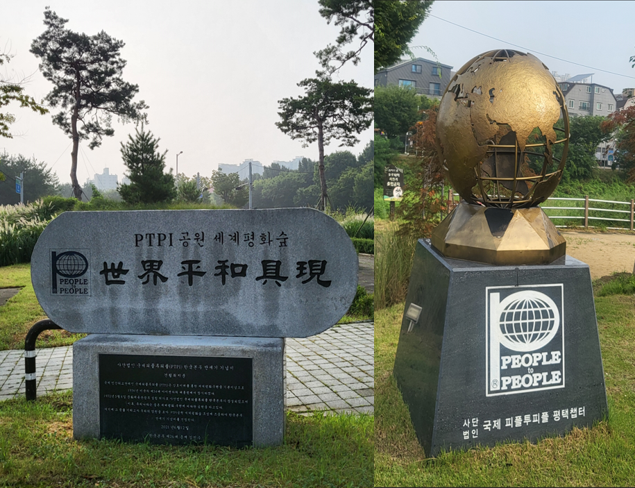 사단법인 국제피플투피플(PTPI) 한국본부 기념비를 만난다. "국제 민간외교단체인 PTPI는 상호이해를 통한 세계평화구현을 기본이념으로, 1956년 미국의 제34대 아이젠하워 대통령이 창시하였다. 1972년 5월 8일 문체부의 설립허가로 사단법인 PTPI 한국본부가 창설되었으며, 이후 우리나라는 물론 세계평화 구현에 커다란 공헌을 하고있다. 여기에 그 뜻을 기리고자 우리의 염원을 모아 PTPI 공원 세계평화숲 조성에 즈음하여 한국본부 반세기 기념비를 건립한다. 2012년 6월 12일 한국본부 제26대 총재 김진수."