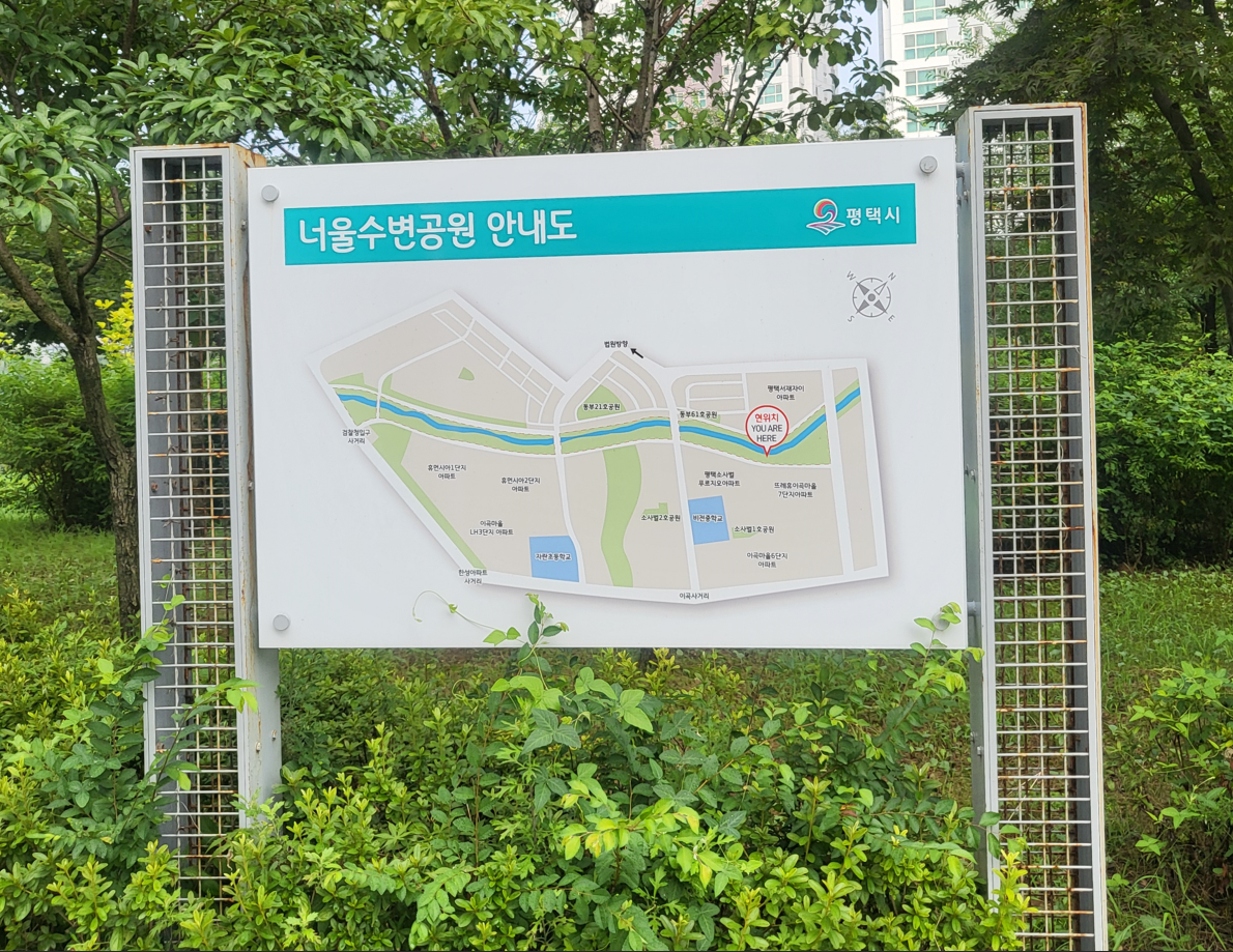 너울수변공원 안내도를 만난다. 너울수변공원은 통복천 옆으로 개울길따라 길게 조성된 공원이다. 통복천 좌우로는 동부21호 공원, 동부 61호 공원, 소사벌2호 공원, 소사벌1호 공원이 있다. 이곳 평택의 소사벌 지구 아파트 숲 사이로 시냇물이 흐르는 '소리 수변 공원'은 도심속 자연이라고 그렇게 말하고 싶다.