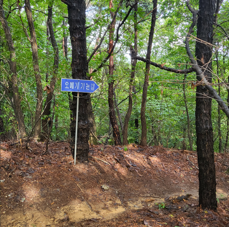 이렇게 멋진 길이 오매기길이다. 오매기 마을의 산세가 5마리의 말이 각각의 기수를 태우고 달리는 형상을 하고 있다고 하여 오마동이라고 했다고도 한다. 오매기 마을은 토속적인 시골길의 편안함과 농촌 마을 풍경을 볼 수 있어 과거를 보러 이길로 걷는 선비들에게도 삼남길에서도 으뜸가는 풍경으로 유명하며, 1945년 8ㆍ15 해방 때에 약 70호 정도였다고 한다. 또 다른 설은 그곳에 집(幕)이 다섯 채가 있어서 ‘오막(五幕)>오막이>오매기’가 되었을 것으로 보는설도 있단다. 내가 걷는 이 길가에 만들어 놓은 표지판에도 오매기와 오메기가 같이 쓰이고 있어서 어떤 표현이 정확히 맞는지는 잘 모르겠다.