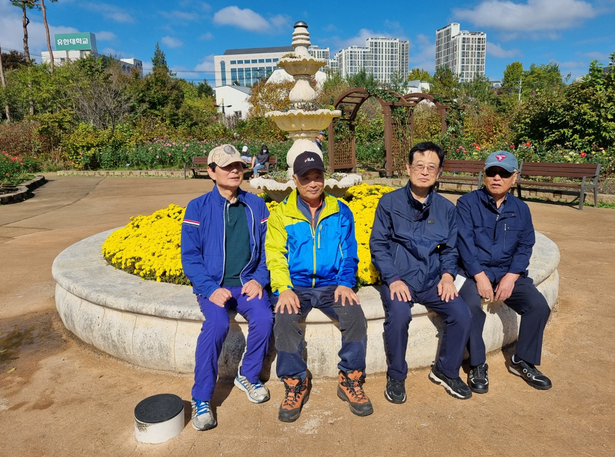 사진속에 유한대학교 표지판이 보이는 수목원, 같은 사무실에서 함께 일했던 젊은 날들의 기억을 반추하며 모임을 갖는 OB 23명의 멤버 중에서 오늘은 겨우 다섯명이 모인 우리들 모습이 노오란 국화꽃 앞에서 조금은 쓸쓸하게 가을처럼 보인다. 이제는 몇번이나 더 얼굴로 마주할 수 있을런지, 얼마나 더 오래도록 함께 걸을 수 있을런지 짐작 할 수 없는 나이라서 그런지 정겨움의 계절이 담겨서 스르륵 흐르고 있다.