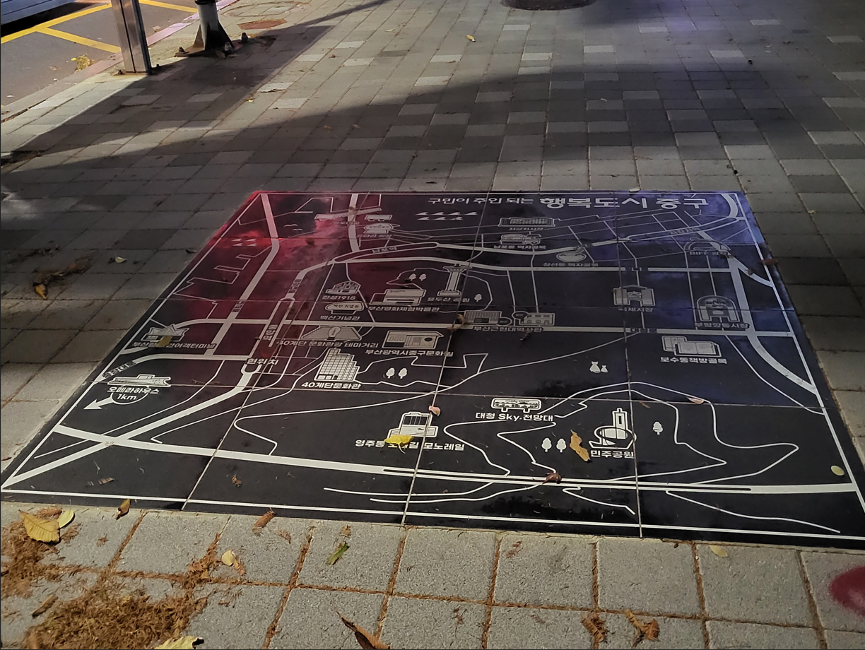 부산 중구 도로지도 안내판이다. 부산 도심기능수행의 중구는 업무기능 집중으로 금융, 무역, 정보, 통신, 상사기능 밀집과 도심상가 지역으로 부산상권 중심지, 유동·생활인구 운집 그리고 부산의 관문으로 연안여객부두 소재, 국제여객부두 및 부산역 인접 또한 문화관광 자원으로 용두산공원, BIFF광장, 광복로, 책방골목 등이 한국의 현관인 부산항의 중추기능을 담당하고 있는 중구이다. 중구의 동쪽은 영주천, 서쪽은 보수천을 경계로 하고 있으며 북쪽으로는 복병산을 접하고 남쪽은 바다에 임하고 있다.