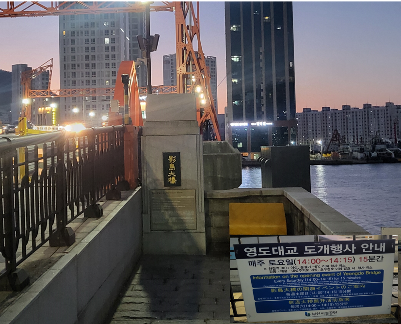 영도대교를 만났다. 벌써 육십년도 더 지나버린 오래된 기억으로도 중학교 시절 졸업여행으로 찾아왔던 이곳 모습이 떠 오른다. 이곳은 47년만에 도개가 회복된 부산 최초의 연육교다. 한국전쟁 당시 영도다리 난간위에 이름을 새기고 흩어진 가족의 소식을 기다리는 사람들이 모여 들었던 곳이란다. 노래가사에도 종종 등장하는 영도대교는 사랑과 그리움을 상징한다. 지금은 매주 토요일 2시부터 약 15분간 영도다리가 위로 올려 들려지는 도개가 진행된다고 한다.