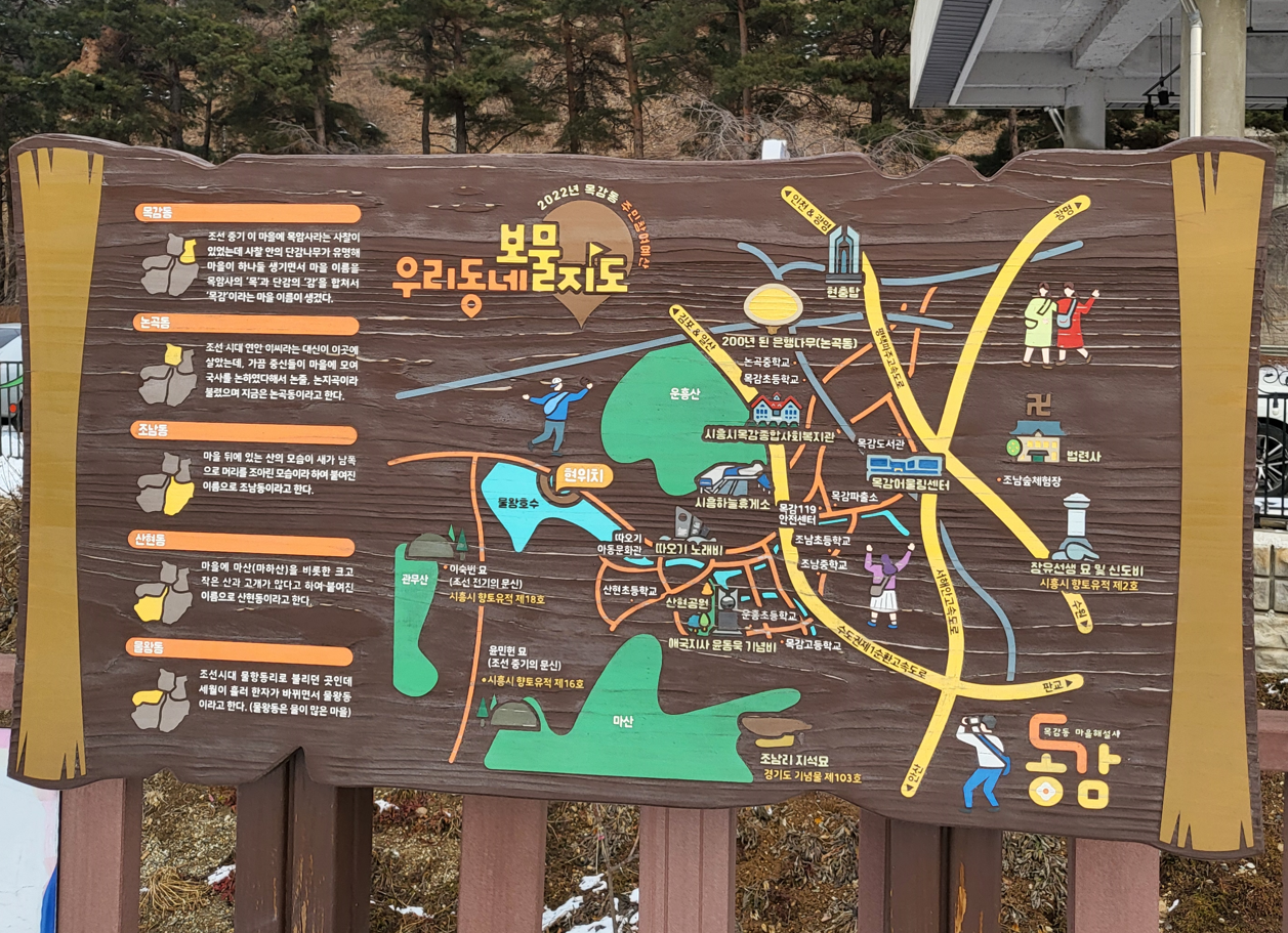 '우리동네 보물지도' 안내판이다. 목감동, 논곡동, 조남동, 신현동, 물왕동을 소개하고 있다. 목감동 - 조선중기 이 마을에 목암사라는 사찰이 있었는데 사찰안의 단감나무가 유명해 마을이 하나둘 생기면서 마을 이름을 목암사의 '목'과 단감의 '감'을 합쳐서 목감이라는 마을이름이 생겼다. 물왕동 - 조선시대 물향동리로 불리던 곳인데 세월이 흘러 한자가 바뀌면서 물왕동이라고 한다.