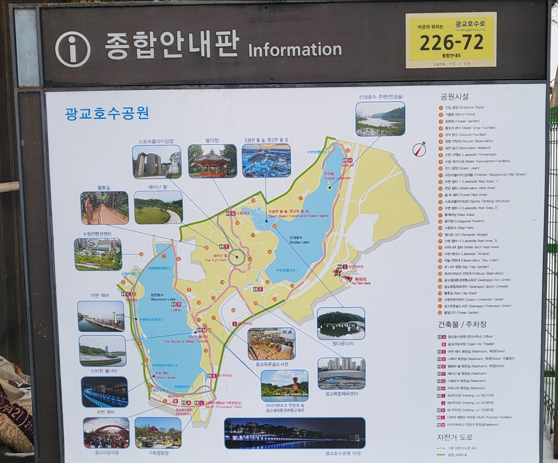 호수길을 돌아들면서 이런 광교호수공원 안내표지판을 자주 만난다. 이곳은 원래 수원시 영통구 하동에 있었던 원천유원지(遠川遊園池) 호수공원으로, 현재는 광교호수공원으로 바뀌었다. 수원 시가지에서 동쪽으로 약 5km 정도 떨어져 있다.