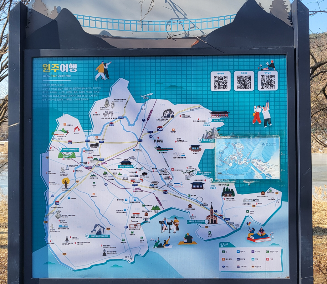 원주여행 안내판 모습이다. 주변에 두몽폭포·판대천·삼봉· 치악산국립공원 등이 있다. 찾아가려면 중앙선 기차를 타고 동화역에서 내리거나 원주시내에서 간현리행 시내버스를 탄다. 승용차로 가려면 영동고속도로에서 문막인터체인지로 나와 원주 방향으로 43번 국도를 타고 가다가 동화교를 건너 오른쪽으로 언덕을 넘은 뒤 지정초등학교와 경장교를 지나면 관광지 입구가 나온다.