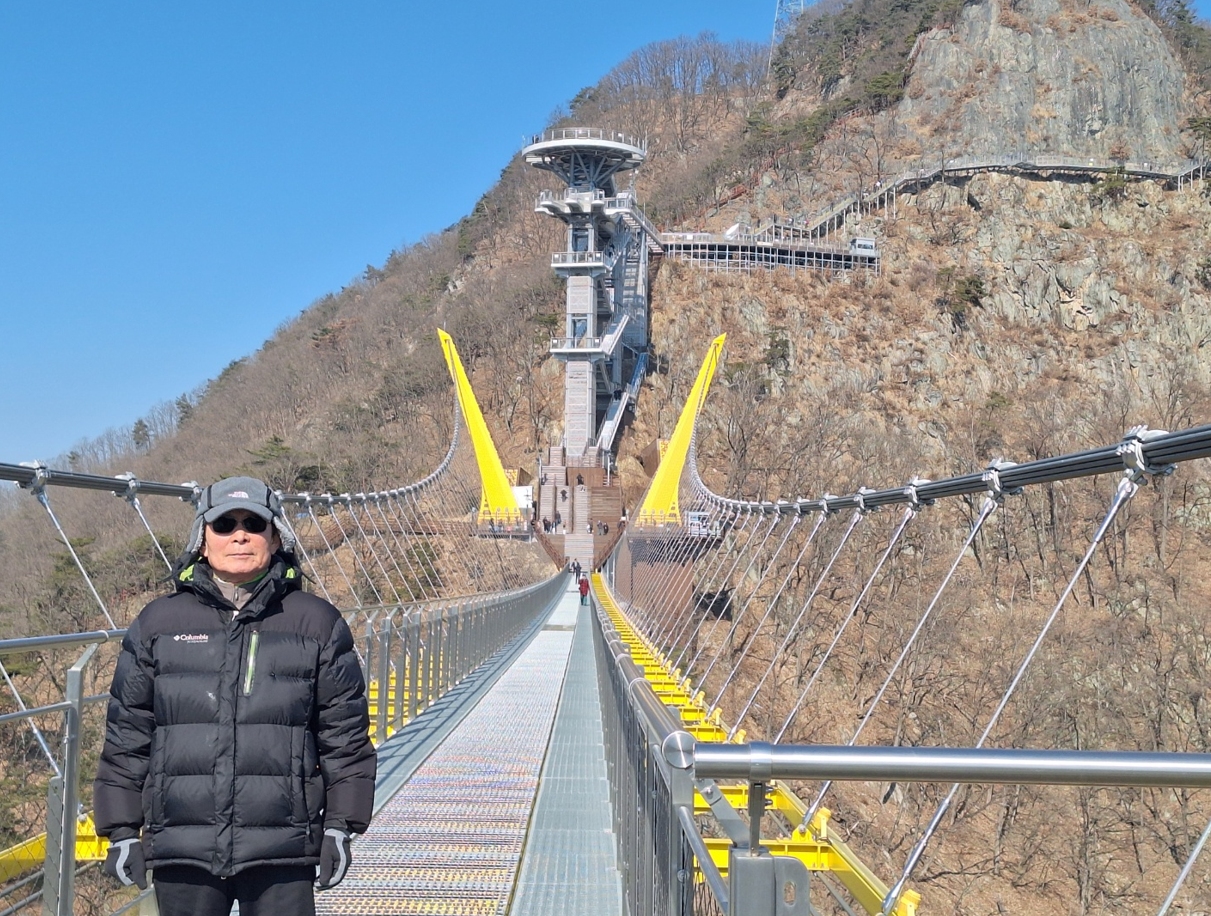 데크길 계단을 오르면 소금산 출렁다리를 만난다. 소금산 출렁다리는 2018년 2월에 처음 찾아왔었던 기억이 난다. 이곳은 연간 약 400만 명이 방문하는 곳으로 원주를 대표하는 관광시설로 자리매김했다. 개장당시 높이 100m, 길이 200m로 산악 보행교 중 국내 최장, 최고의 규모였다. 한 발짝 디딜 때마다 출렁이는 아찔함과 거칠게 솟은 기암괴석의 절경은 원주의 대표적인 관광지로 부족함이 없는 곳이다.