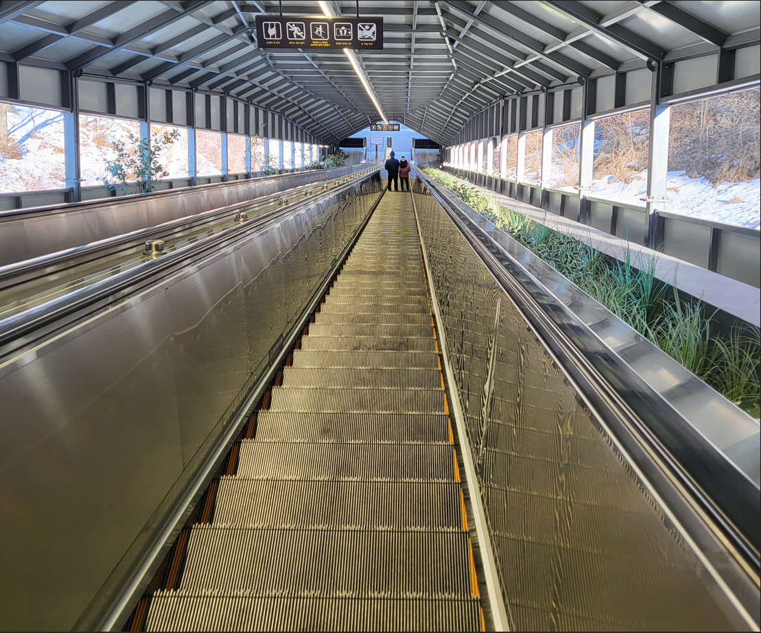 울렁다리 종점에서 내려오는 에스컬레이터 모습이다. 소금산 울렁다리에서 내려오는 높이만큼이나 길이가 길어서 네곳의 에스컬레이터를 번갈아 갈아타야만 한다.