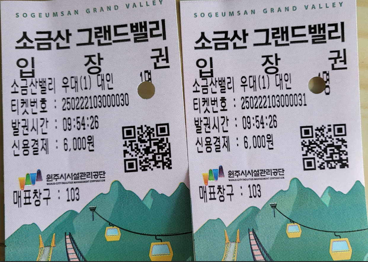 소금산 그랜드밸리는 입장권을 구매하여야 출입이 가능하다. 소금산 그랜드밸리 통합권은 대인(만 13세 이상) 9,000원, 소인(만 7세 이상 ~ 만 12세 이하) 5,000원이다. 나는 신분증을 제시하여 우대권으로 6,000원인 입장권을 받았다.