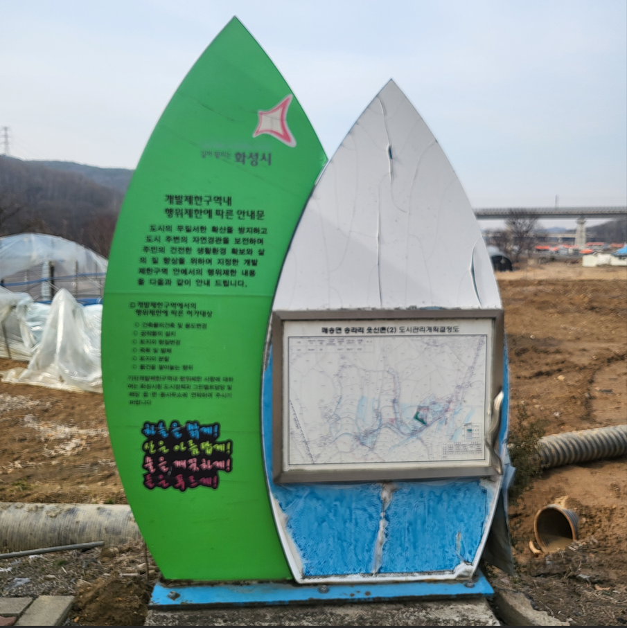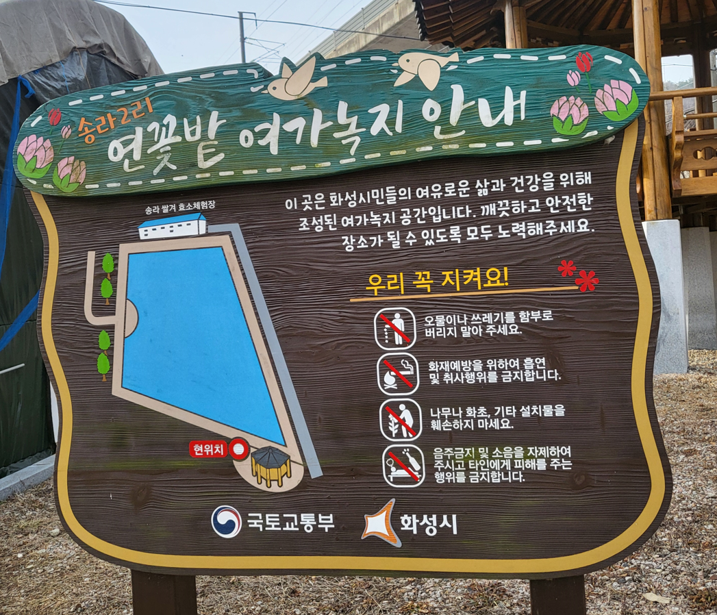 바로 이웃하여 연꽃밭 여가녹지 표지판이 나타난다. 여가녹지는 화성시민들의 여유로운 삶과 건강을 위해 조성된 공간으로 저수지 주변을 산책하다 정자에서 연못에 핀 연꽃들을 감상하며 쉬어갈 수 있다고 소개한다.