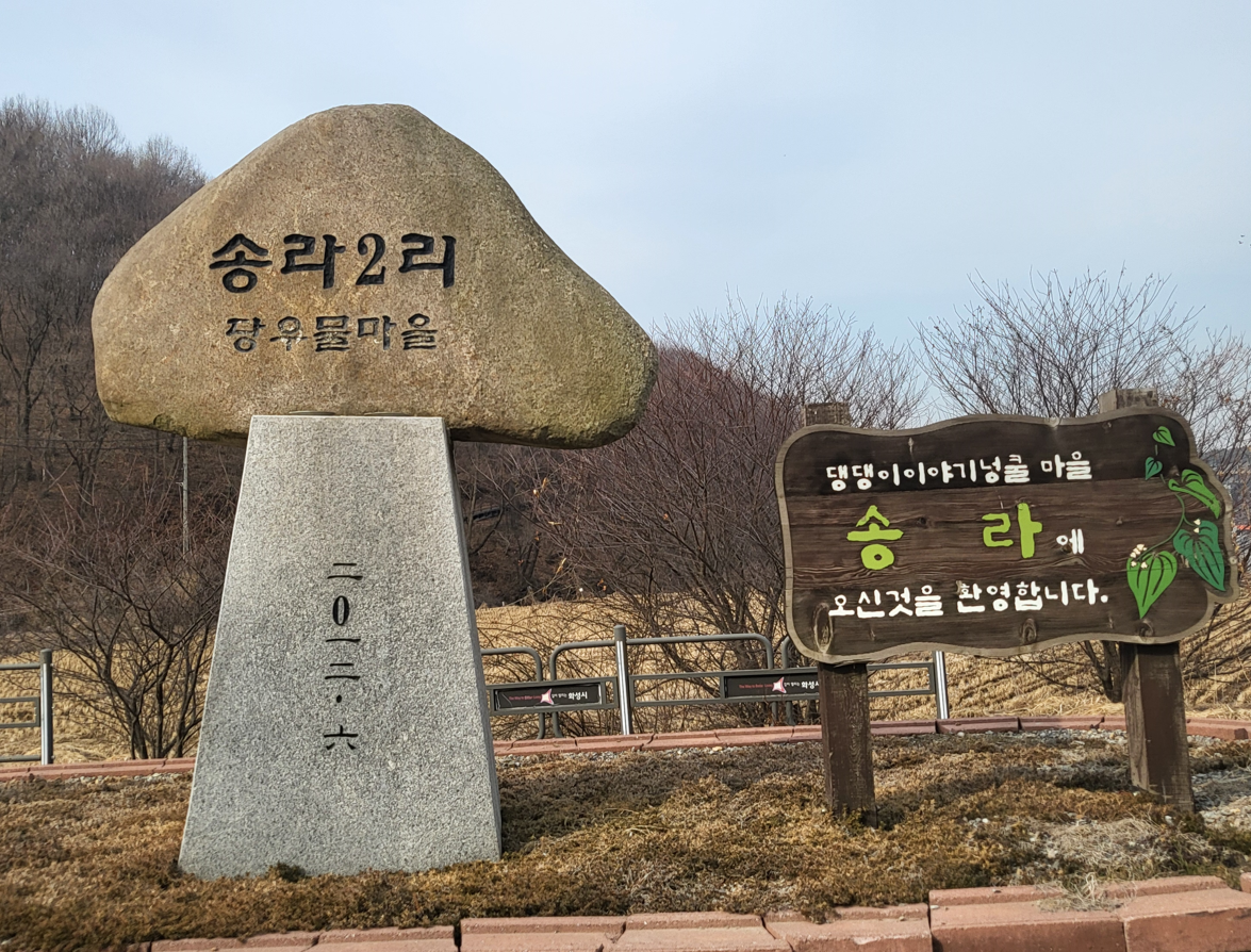 경기도 화성시 매송면 송라리 284-1에 조성된 송라저수지둘레길은 2.4km로 걷는 시간이 약34분정도 소요된다. 송라리(松羅里)는 서해안고속도로와 39번 도로에서 경기도 안산시와 경계를 이루는 화성시 북쪽 끝자락에 있는 마을이다. 출발지점인 송라2리 당우물마을 표지석과 댕댕이이야기넝쿨 마을이라는 표지판이 만보걷기 시작부터 정겹다.