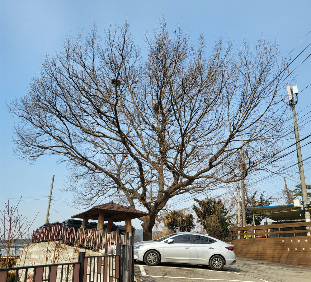 길을 잘못 들어서 산골을 헤매다가 아랫마을을 바라보며 논둑길로 내려오니 송라2리 마을회관앞이다. 마을회관 앞에는 주차장이 있고 주차장 옆에는 사각정자가 여름쉼터로 자리하고 있다. 까치집이 두곳이나 보이는 아름드리 벚나무가 하늘을 향하여 드넓게 팔버린 모습이 너무 믿음직하여 마을의 상징목처럼 느껴진다.