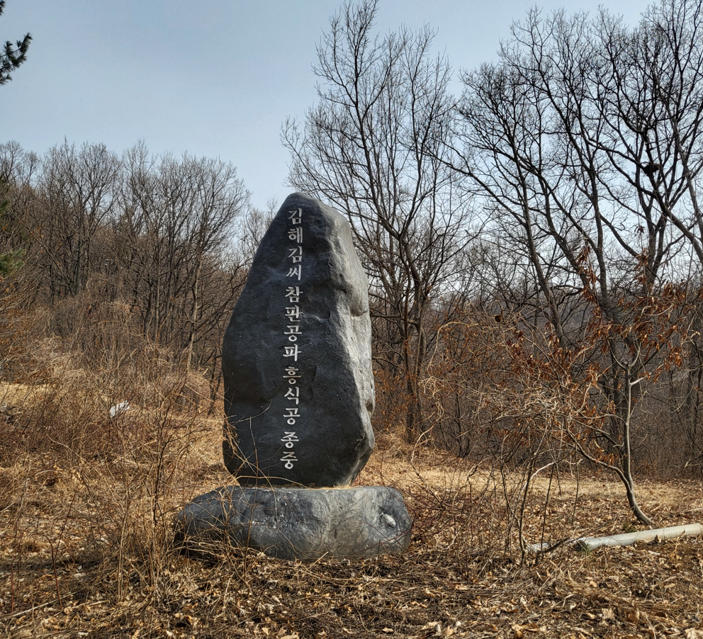 걷다보니 등산로가 있어서 따라 올랐더니 김해김씨 참판공파 흥식공 종중이라는 커다란 바위표지판이 서있다. 이곳은 김해김씨 참판공파 (參判公派)의 종중 산인가 싶다. 참판은 조선조에서 이조참판(吏曹參判), 병조참판(兵曹參判), 호조참판(戶曹參判) 등 벼슬을 하였거나 참판(參判)에 증직되신 분과 그 이하 자손(子孫)들을 의미한다.