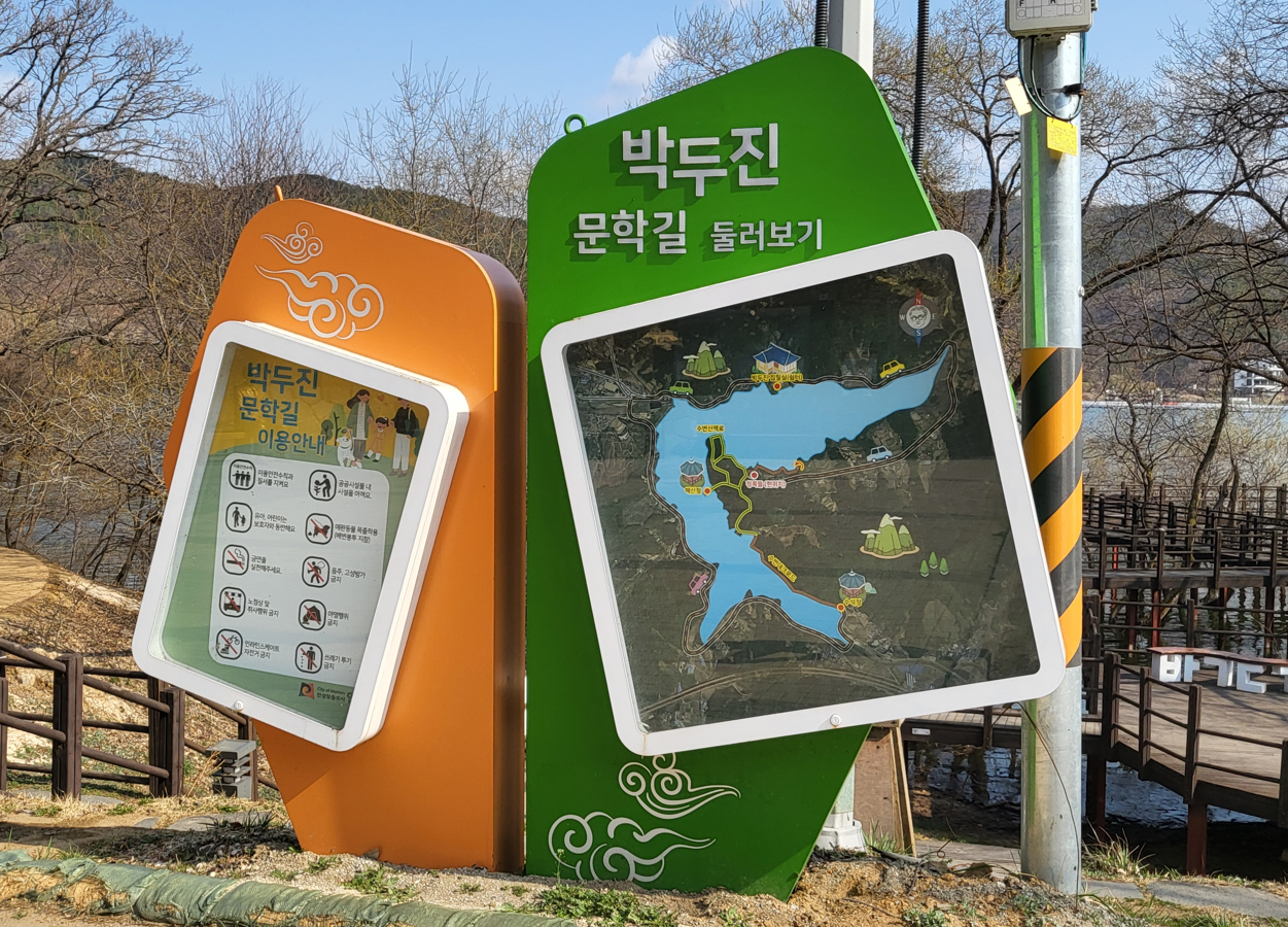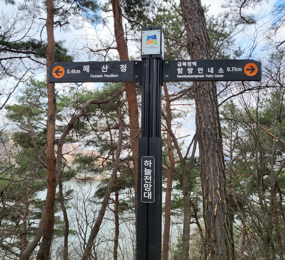둘레길 곳곳에 세워 놓은 박두진 시인의 작품을 읽으면서 걷다보니 금방 하늘전망대 이정표를 만난다. 이곳은 주차장이 있는 출발지점인 금북정맥 탐방안내소에서 부터 700m지점이며, 박두진 시인의 호를 따서 혜산정이라고 이름붙인 호숫가 정자까지는 400m라는 안내가 전망대 바로아래에 자리하고 있다.