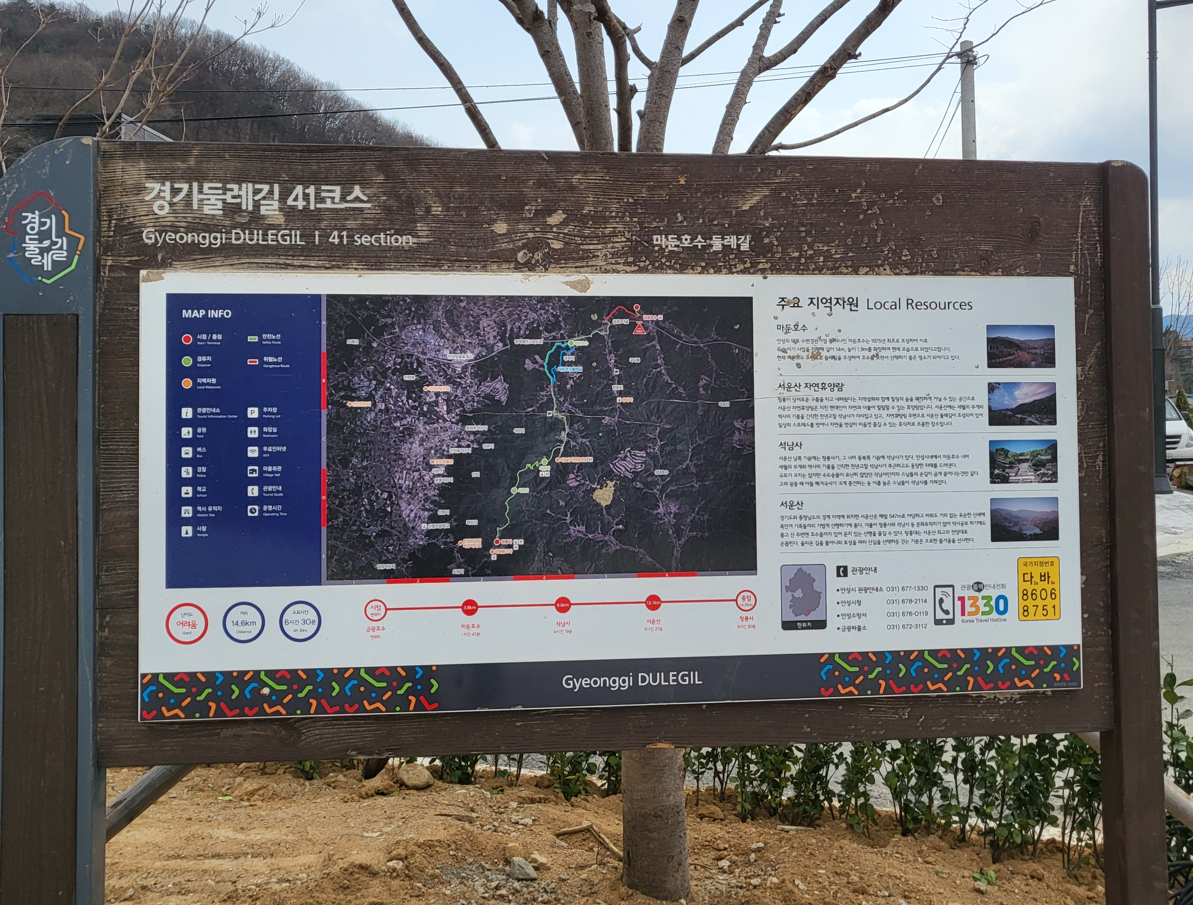 경기둘레길 안성41코스는 총길이 15km로 소요시간 약6시간30분 정도, 시작지점인 금광호수(수석정 : 경기도 안성시 금광면 현곡리 40)에서 종료지점인 청룡사(경기도 안성시 서운면 청용리 69-5)까지 걷는 길이다. 경로정보는 금광호수(수석정)→마둔호수→석남사→서운산→청룡사 코스로 사계절 걷기에 좋은 코스이다.