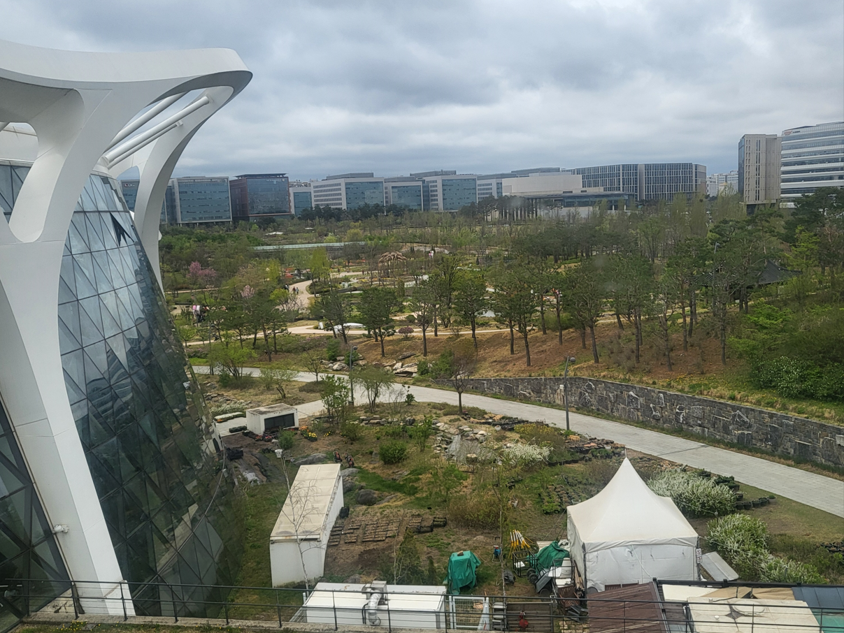 점심시간에 식물원(주제원)의 4층 한정식 식당에 앉아 창밖으로 내다본 식물원의 남쪽 풍경이다. 식물원(botanical garden, botanic garden)은 식물명으로 표시된 다양한 식물들의 수집, 재배, 보존, 전시 등을 위한 정원이다. 선인장과 다른 다육식물, 허브정원, 세계 특수 지역의 식물 등과 같은 전문 식물 수집품을 포함할 수 있으며, 열대식물, 고산식물 또는 다른 외래 식물과 같은 특별한 수집품과 함께 온실과 그늘집이 있을 수 있다. 식물원의 방문객 서비스에는 관광, 교육 전시, 미술 전시회, 도서실, 야외 연극 및 음악 공연, 기타 오락 등이 포함될 수 있단다.