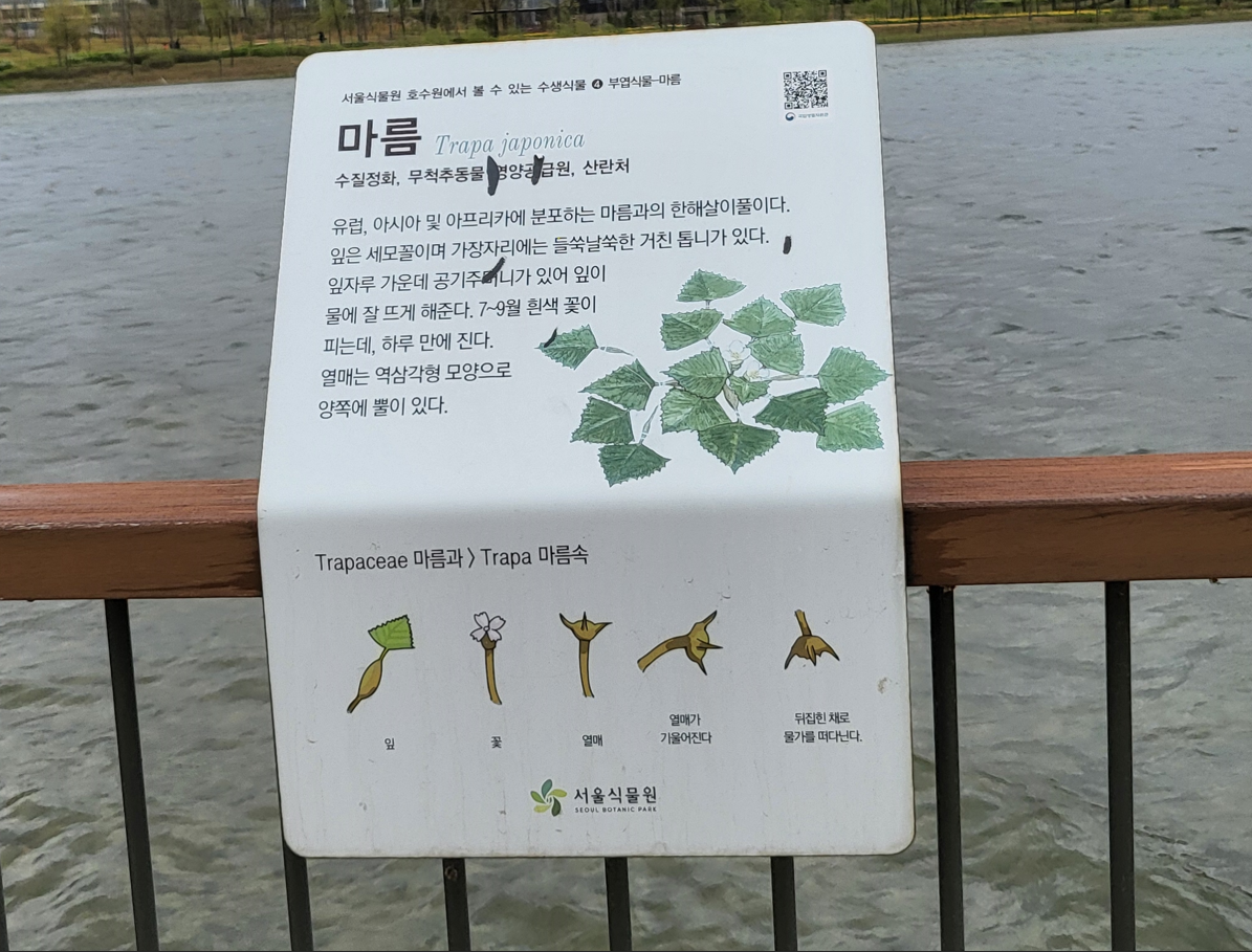 호수원에 붙은 수생식물의 설명 중에서 마름이 눈에 꽂힌다. 내가 다닌 중학교 교모에 붙은 뺏쥐가 바로 삼각형 마름이었다. 공교롭게도 오늘이 4 ·19혁명의 그날이다. 당시는 중학교 1학년생으로 그 시절에는 라디오 같은 매스컴이 가정마다 보급되지 않았기에, 세상 돌아가는 소식을 전혀 모른채 친구들과 함께 등교하니 교문 앞에서 3학년 선배들이 곤봉을 든채 우리들에게 곤봉을 휘드르며 집으로 돌아가라고 외쳤던 기억이 솟아난다.