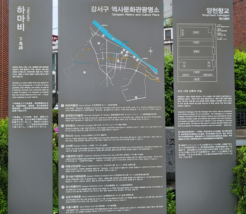 강서구 역사문화관광명소 안내판이다. 우리나라 특유의 산수화인 진경산수화를 창안한 겸재 정선(1676~1759)이 65~70세때 양천현령으로 근무한 양천현(지금의 강서구 가양동 일대) 현장의 다양한 이야기가 서린 코스이다. 서울에 유일하게 남았는 향교도 만나보고, 겸재 정선 미술관에서 진경산수화의 진품도 감상하며 하마비-> 양천향교-> 겸재정선미술관-> 양천고성지-> 궁산산책로-> 소악루-> 성황사 코스이다.