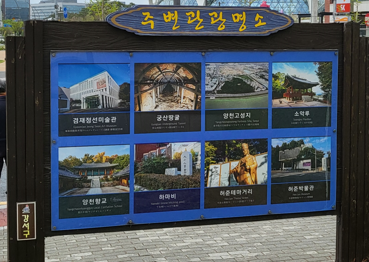 강서구의 주변관광안내도에는 코스별 거리가 지도와 함께 소개되어 있다. 겸재정선미술관->궁산땅굴-> 양천고성지-> 소악루-> 양천향교-> 하마비-> 허준테마거리-> 허준박물관까지 8개 지점 3.2 km를 약1시간 거리로 만보걷기 코스로는 비교적 짧은 편이다. 걷기코스에는 신호등이나 교차로가 없는 직선도보 거리가 좋다.