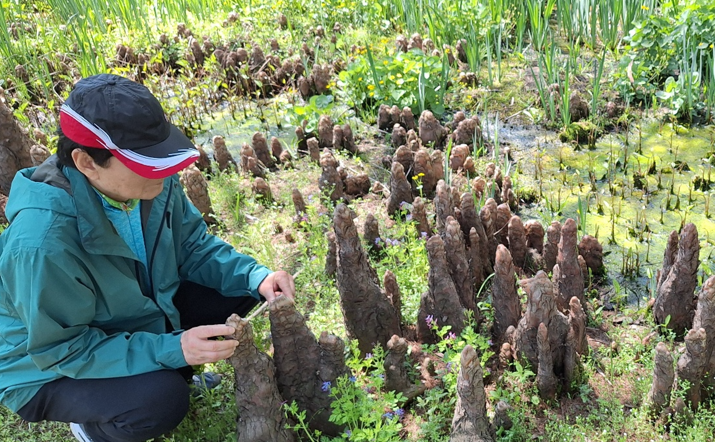 낙우송 아래에 신기하게 자라는 바위같은 식물이 보인다. 이것이 공기뿌리(Aerial Root)란다. 낙우송은 해변가, 석회암, 늪지대에서 자라는 식물이라서 물 속에서는 공기가 통하지 않기 때문에 물 위로 뿌리가 솟아나게 되었고, 이것을 기근 또는 공기뿌리(Aerial Root)라고 부른단다. 기근 또는 공기뿌리는 식물의 호흡을 도울 뿐 아니라 습한 땅에서 2~5m에 달하는 커다란 나무를 지탱해주는 역할도 한단다.
