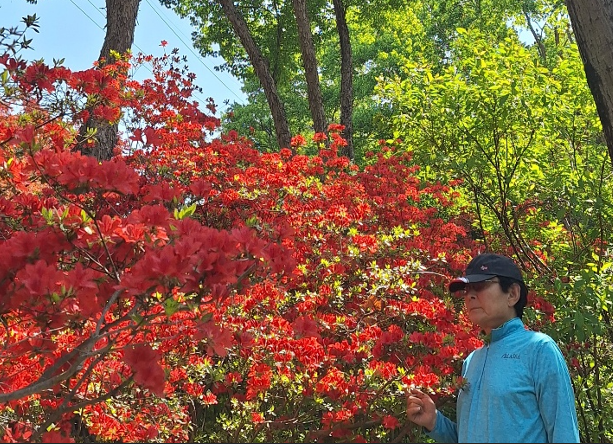 산책로에 조성된 꽃 중에서도 4월과 5월에 만개하는 철쭉이 곳곳에서 발걸음을 멈추게 만든다. 철쭉과 산철쭉은 쉽게 구분하는 법이 산철쭉은 잎이 좁고 끝이 뽀족해지는 형태인 반면 철쭉은 잎이 넓고 동그랗다. 또 산철쭉은 잎 뒷면에 잎맥위에 갈색의 털이 촘촘이 나있는 점이 가장 큰 차이점이다.