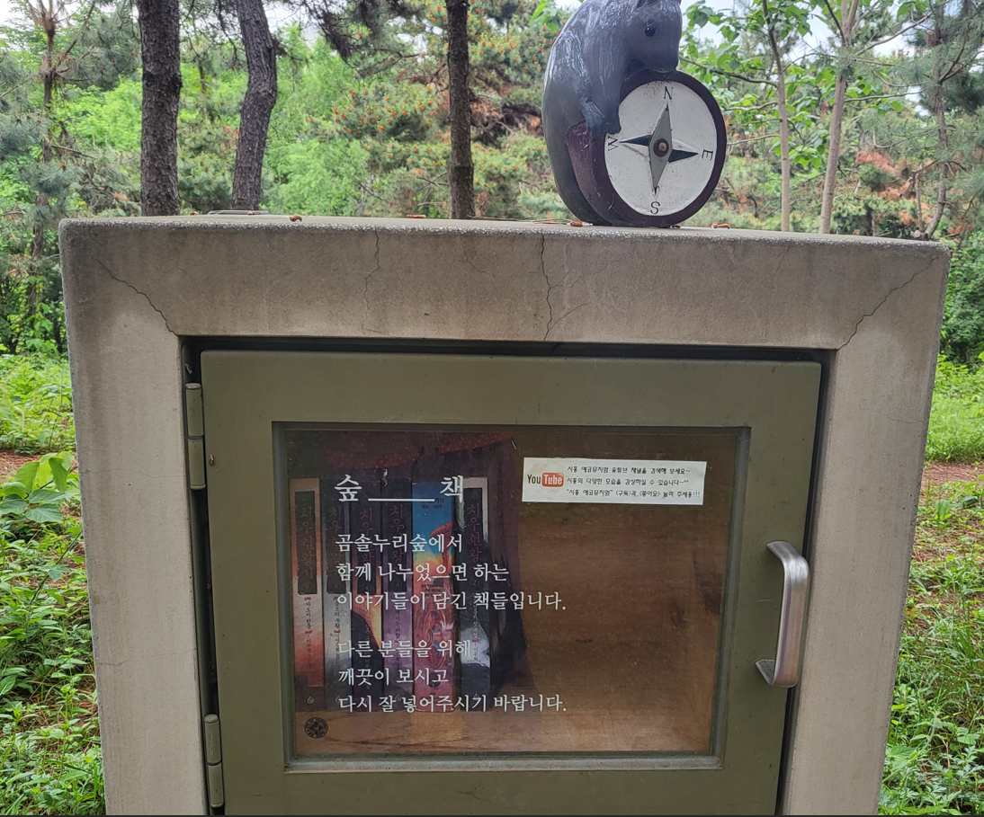 중간에 책장이 보인다. "곰솔누리숲에서 함께 나누었으면 하는 이야기들이 담긴 책입니다. 다른 분들을 위해 깨끗이 보시고 다시 잘 넣어 주시기 바랍니다."고 쓰여져 있다. 책장의 빈 공간을 보면서 문득 집과 사무실에 즐비한 책들 중 이곳에 어울릴만한 이야기책을 골라서, 다음에 여기를 찾아 올 기회가 주어지면 책장의 빈공간에 채워 놓고 싶다.