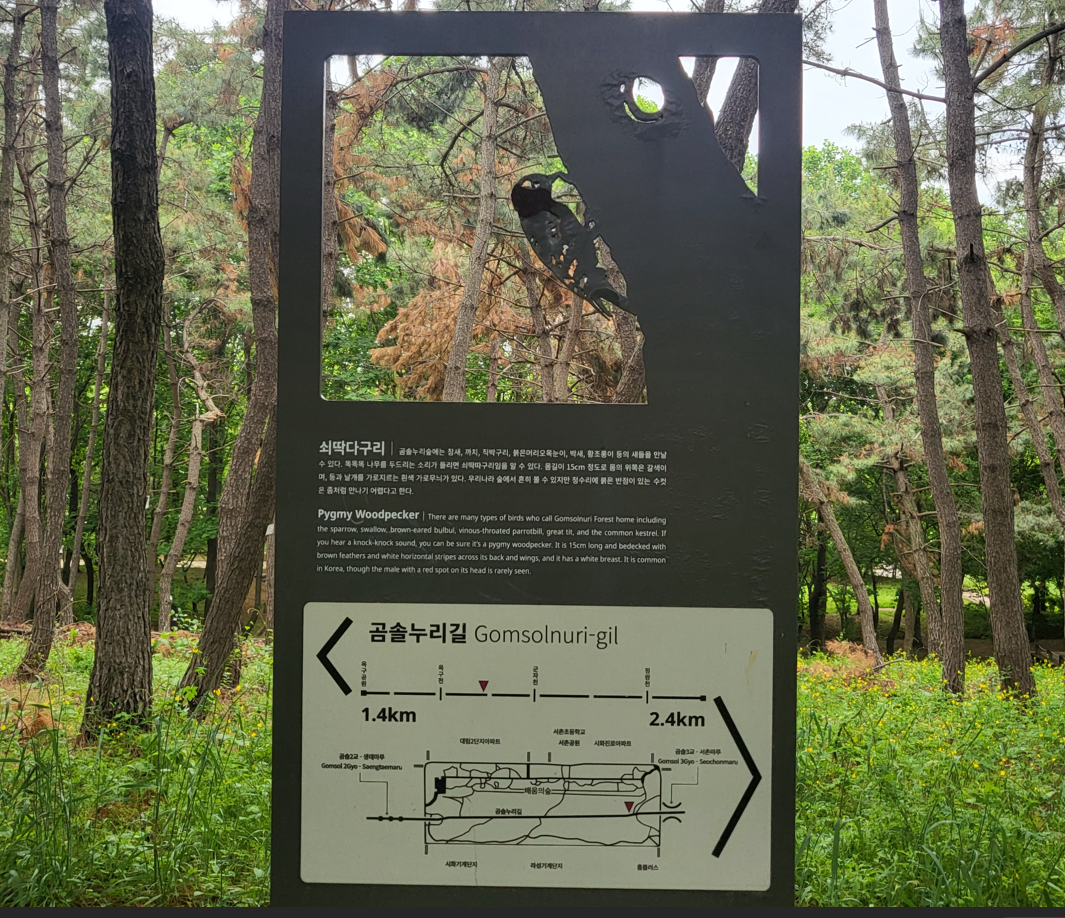 산책로 중간 마다에 설치된 안내판 중 쇠딱다구리(Japanese pygmy woodpecker)판 모습이다. 쇠딱다구리는 몸길이 약 15cm으로 몸의 윗면은 잿빛이 도는 갈색이며 등과 날개를 가로질러 흰색 가로무늬가 나 있다. 우리나라에서는 전국에 걸쳐 번식하는 텃새이다. 단단한 꼬리깃털로 몸을 지탱하여 나무줄기에 세로로 앉거나 나무 주위를 빙빙 돌면서 기어오른다. 나무줄기를 부리 끝으로 쪼아 구멍을 뚫고 긴 혀를 이용하여 곤충의 유충이나 성충을 잡아먹는다.