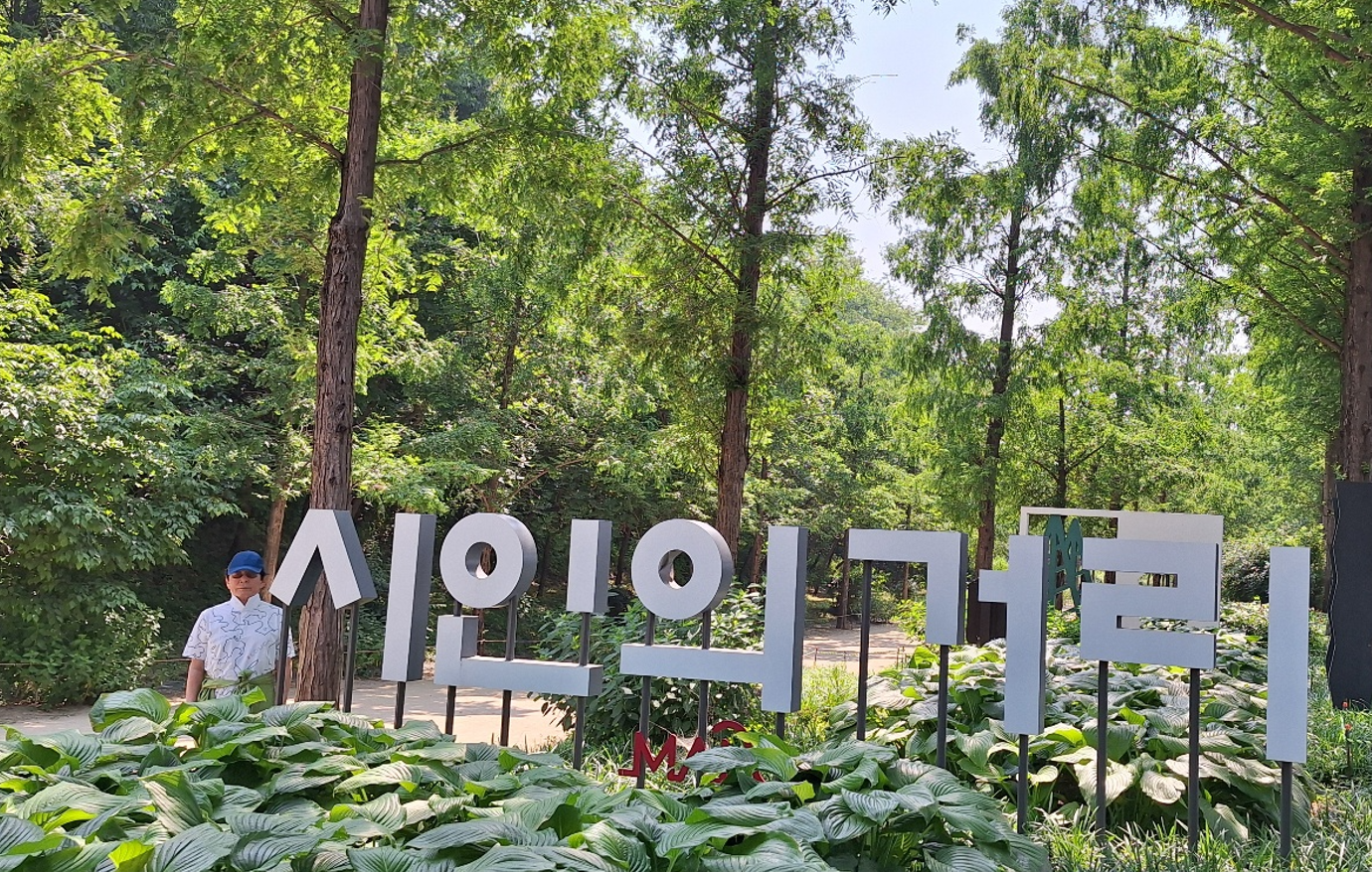 표지석으로부터 처음 배치된 ‘시인 박강수’의 시다. “깊게 어둠이 드리우고/ 바람 속에 냉기마저 자리해도/ 지하로 떠밀려 온 노숙자의 하루 앞에/ 어린 아이의 동전 하나 그 시선 속의 온기/ 나는 사랑을 본다.//…// 사랑 아니면 살 수 없는 이 세상에서/ 누구도 혼자가 아님을/ 추한 것마저 아름답게 만드는/ 사랑을 꿈꾼다./ 모두를 사랑할 수 있는 그 날/ 나는 사랑을 본다”