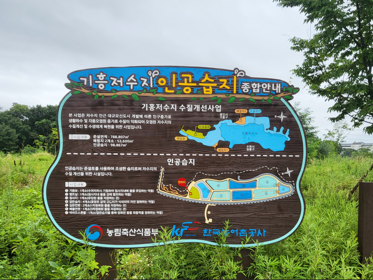 기흥저수지 인공습지는 기흥 호수공원 한쪽에 자릴잡아 호수의 수질개선을 하기위한 시설임을 알기 쉽도록 표지판에 적어 놓았다.